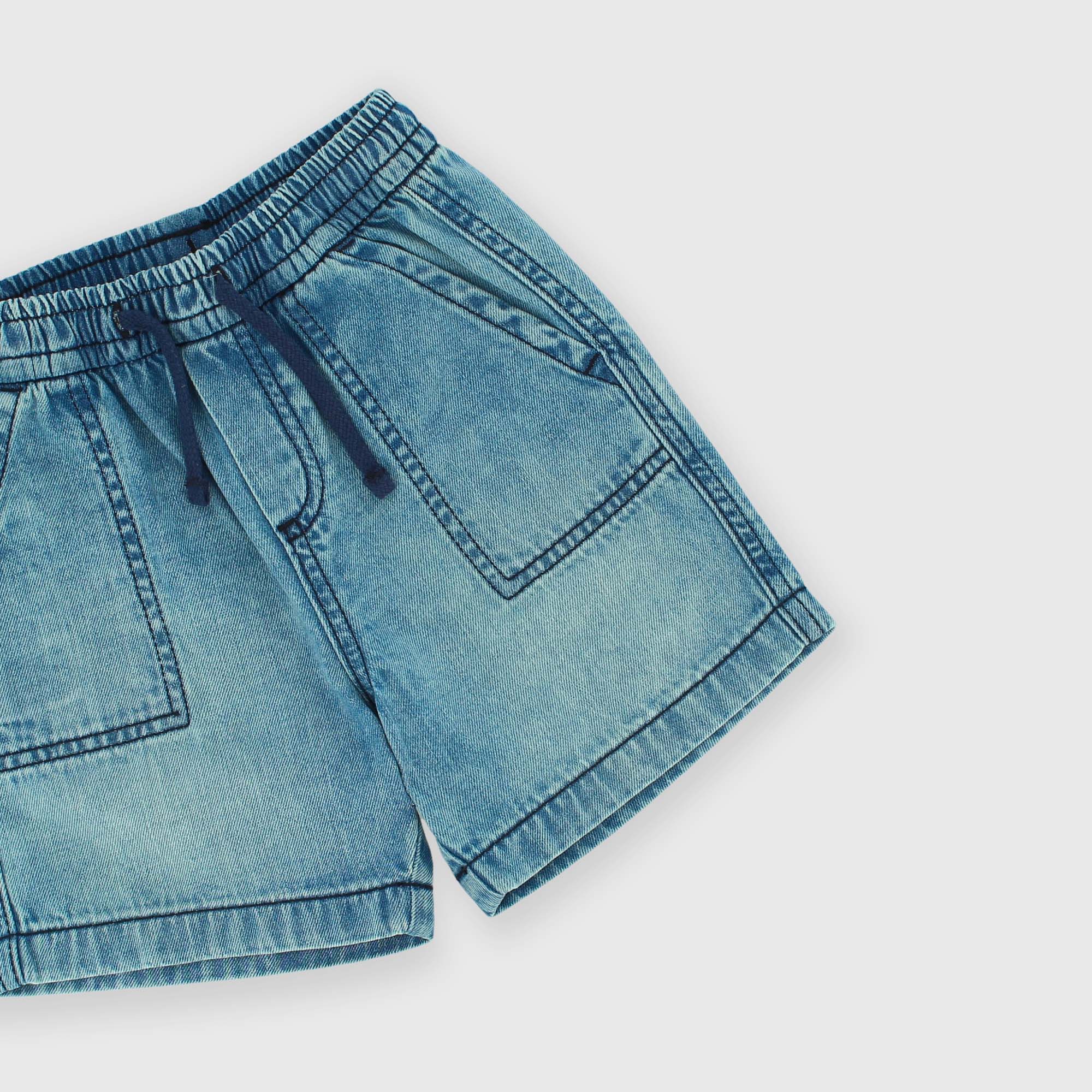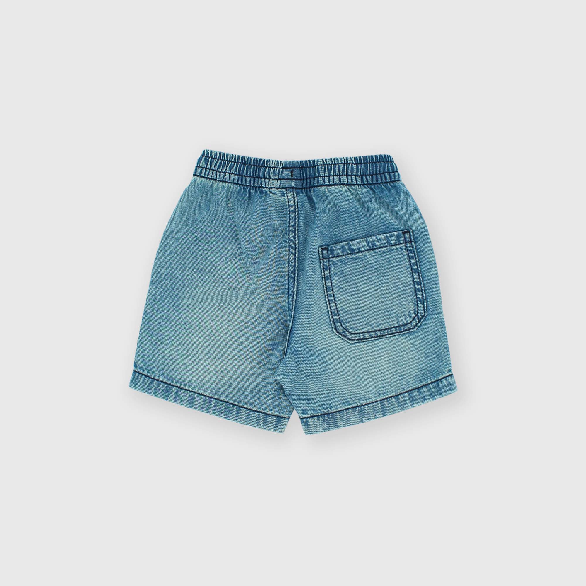 Denim-Bermudashorts mit elastischem Bund und Schnürsenkeln vorne. Taschen auf der Vorderseite und aufgesetzte Tasche auf der Rückseite.