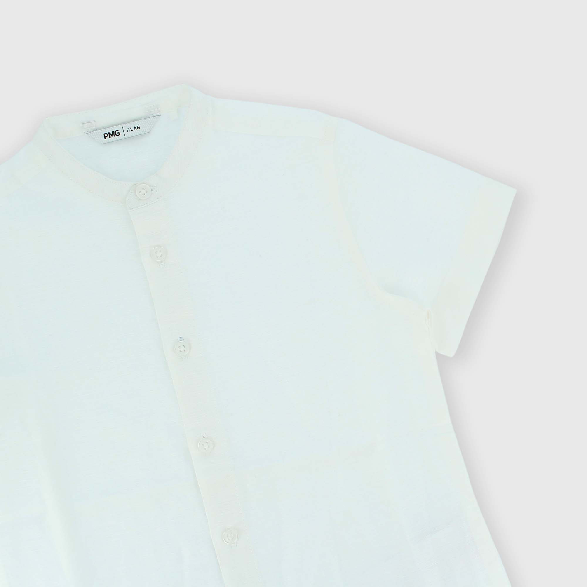 Hemd aus Baumvolle und Leinen, mit Stehkragen und kurze Ärmeln. Knopfverschluss vorne.