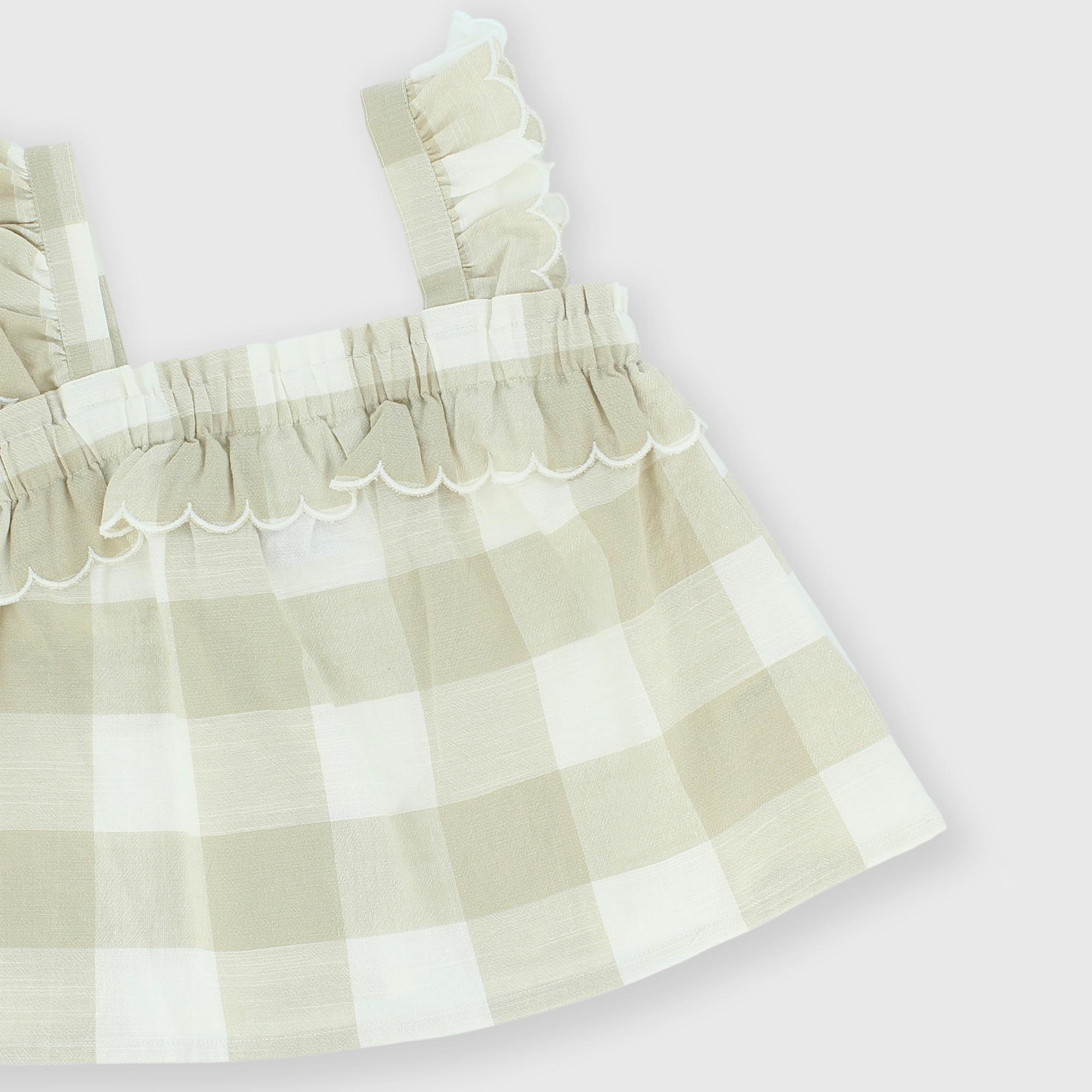 Kariertes Oberteil aus Baumvolle mit quadratischem Ausschnitt. Rüschen an den Hosenträgern und auf der Brust.