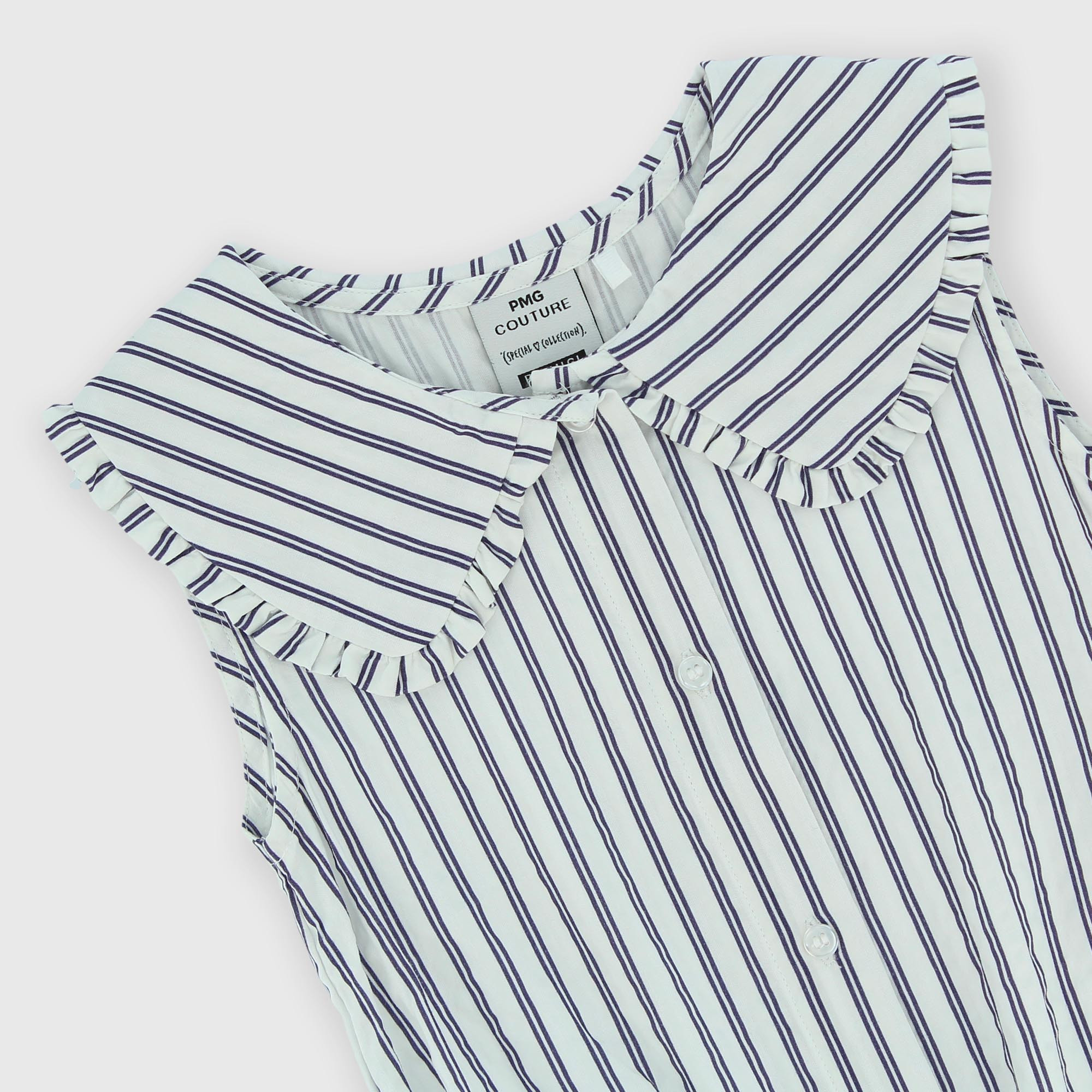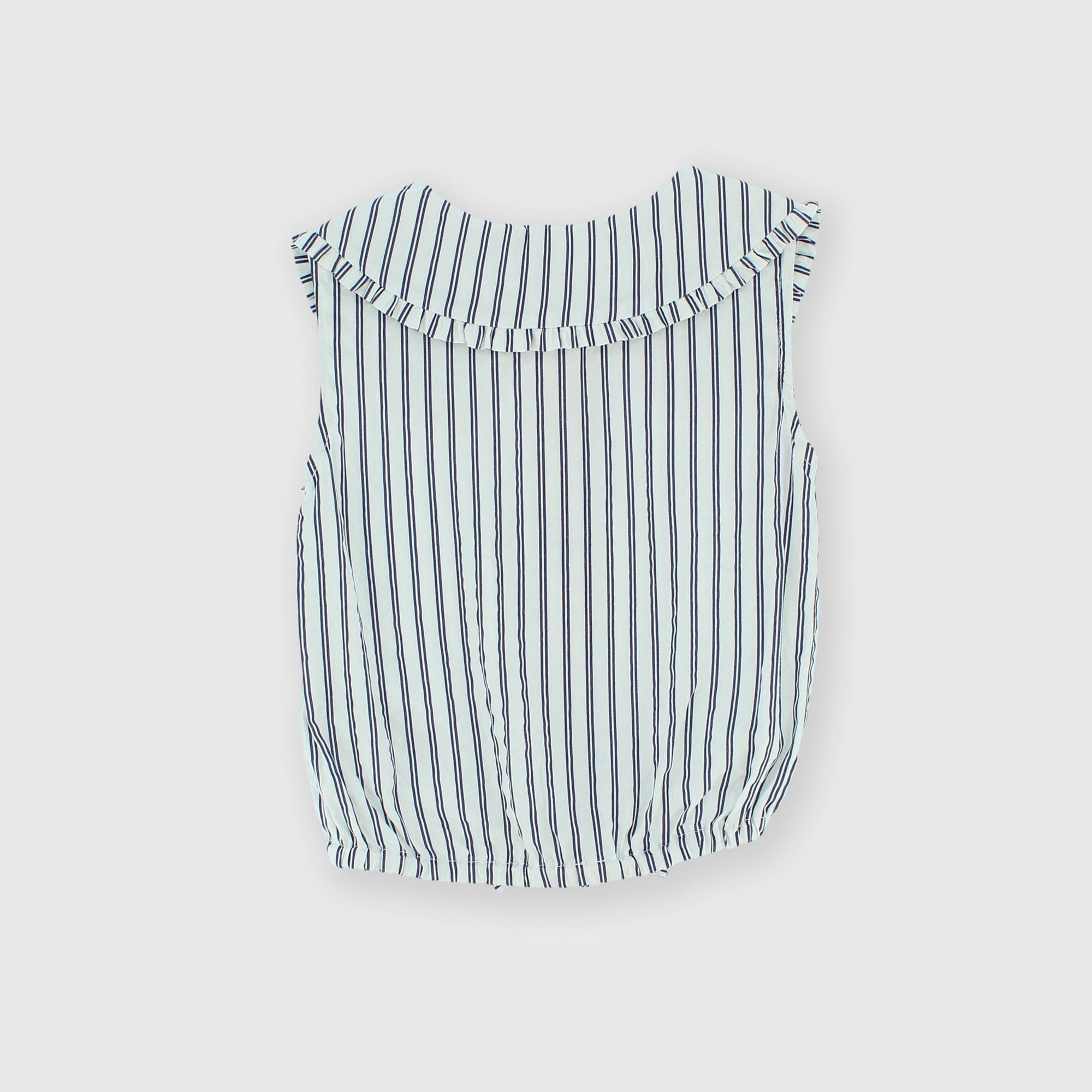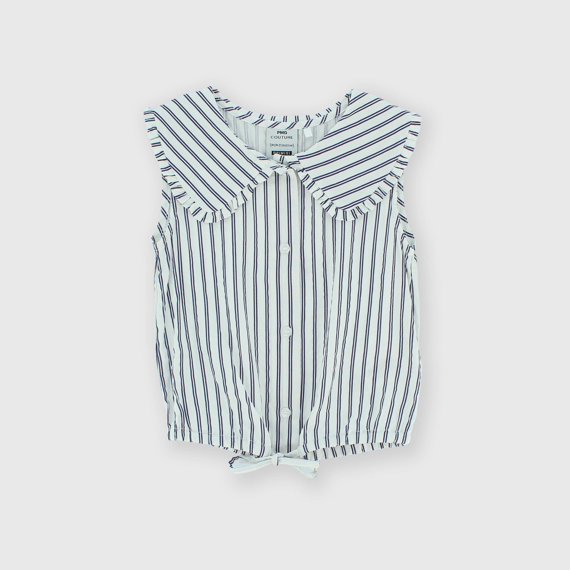 Garngefärbte gestreifte Bluse aus Baumvolle, mit breitem Kragen, Armausschnitten. Knopfleiste vorne und Schnürsenkel an der Unterseite.