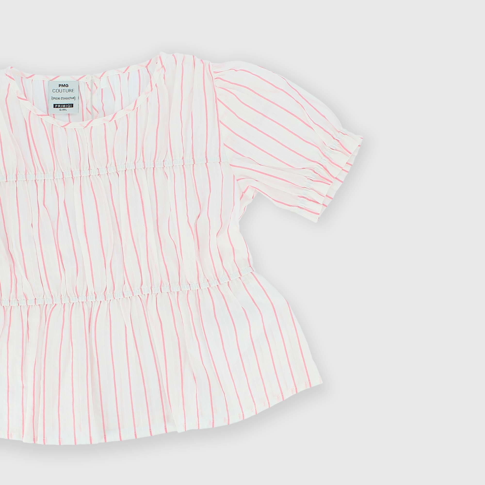Garngefärbtes, gestreiftes Top aus Baumvolle, Rundhalsausschnitt, mit kurze Ballonärmeln. Tropfenverschluss mit Knopf auf der Rückseite. Elastische Nähte.
