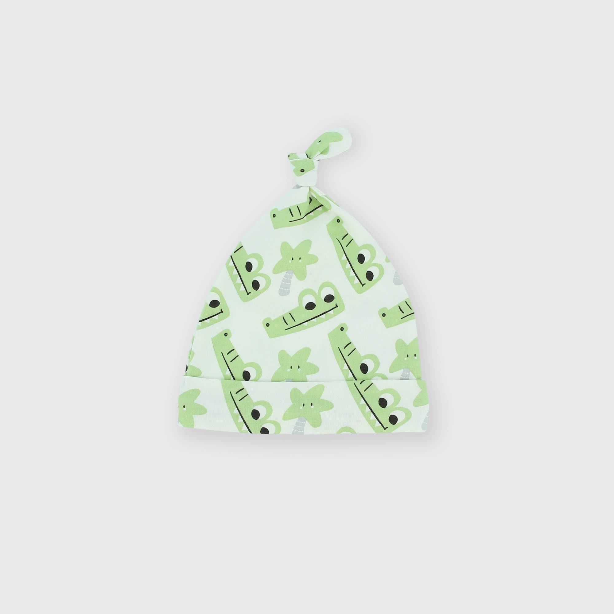 Neugeborenenmütze in Interlock, mit Umschlag und Schleife. Krokodil-Print auf der ganzen Oberfläche.