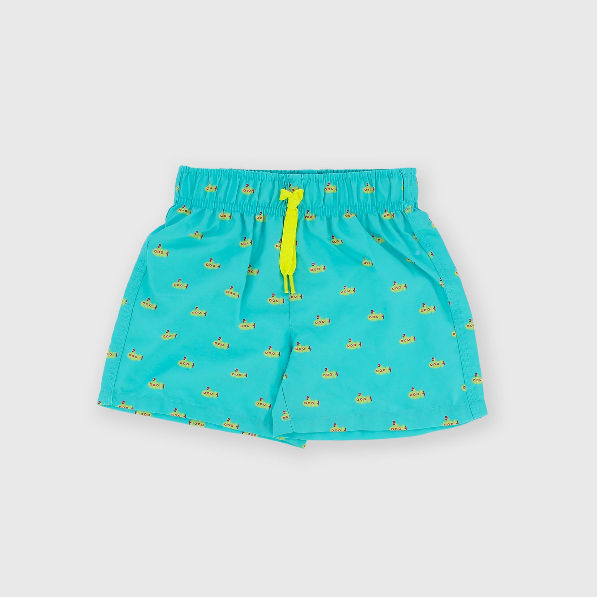 Strandshorts mit elastischem Bund und Schnürsenkeln vorne. U-Boot-Muster. Innenhöschen aus Mikronetz.