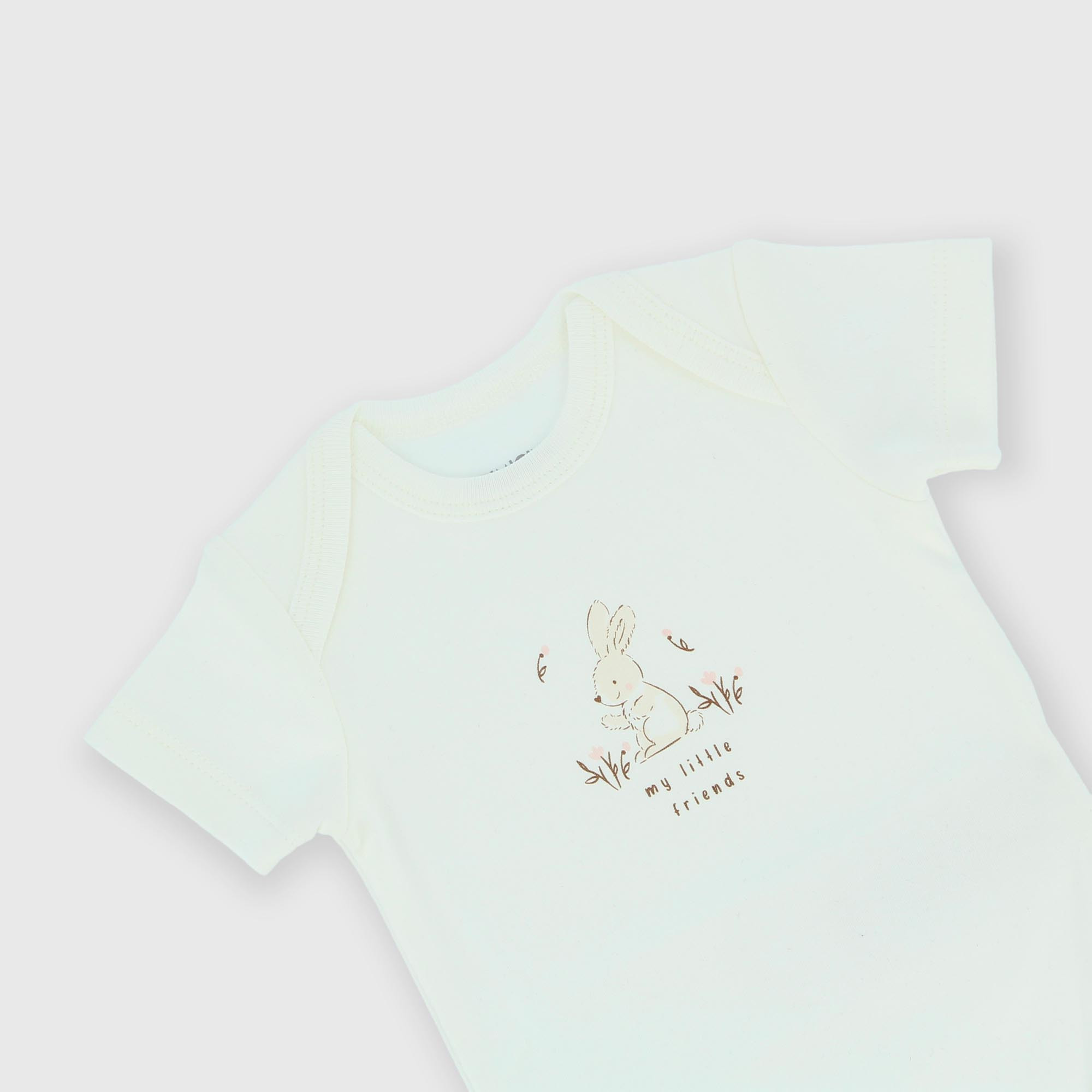 Gerippter Body mit Rundhalsausschnitt, kurze Ärmel. Druckknopfverschluss an der Unterseite. Druck auf der Vorderseite.