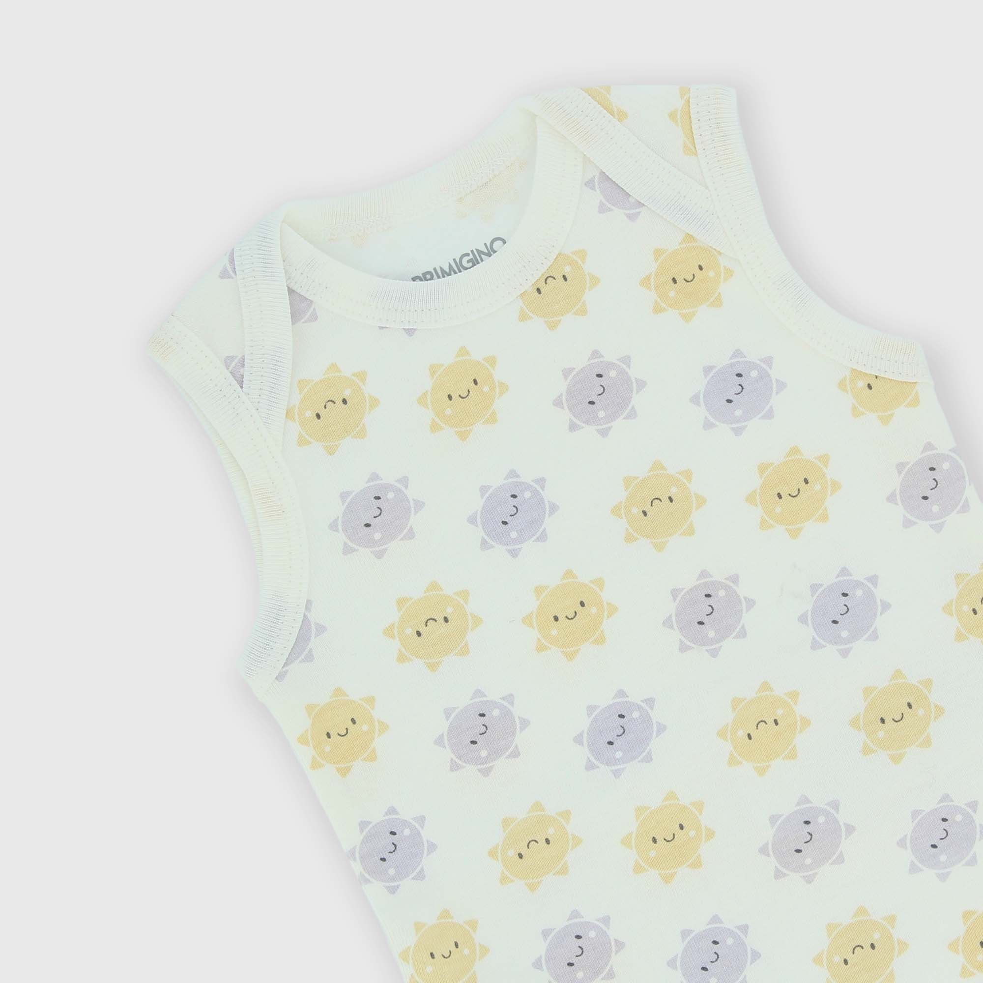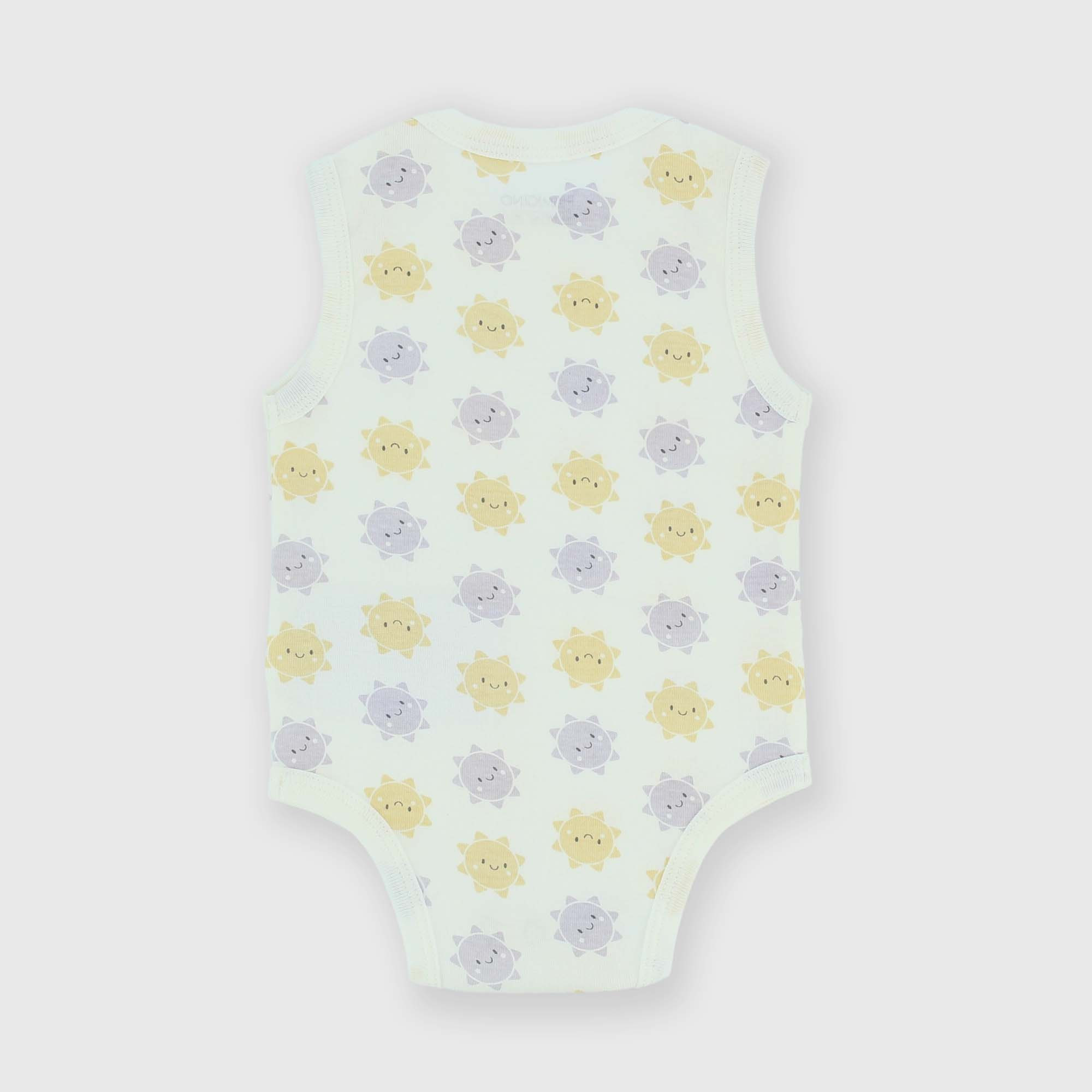 Gerippter Body mit Rundhalsausschnitt, Armausschnitten. Druckknopfverschluss an der Unterseite. Allseitiger Sonnendruck.