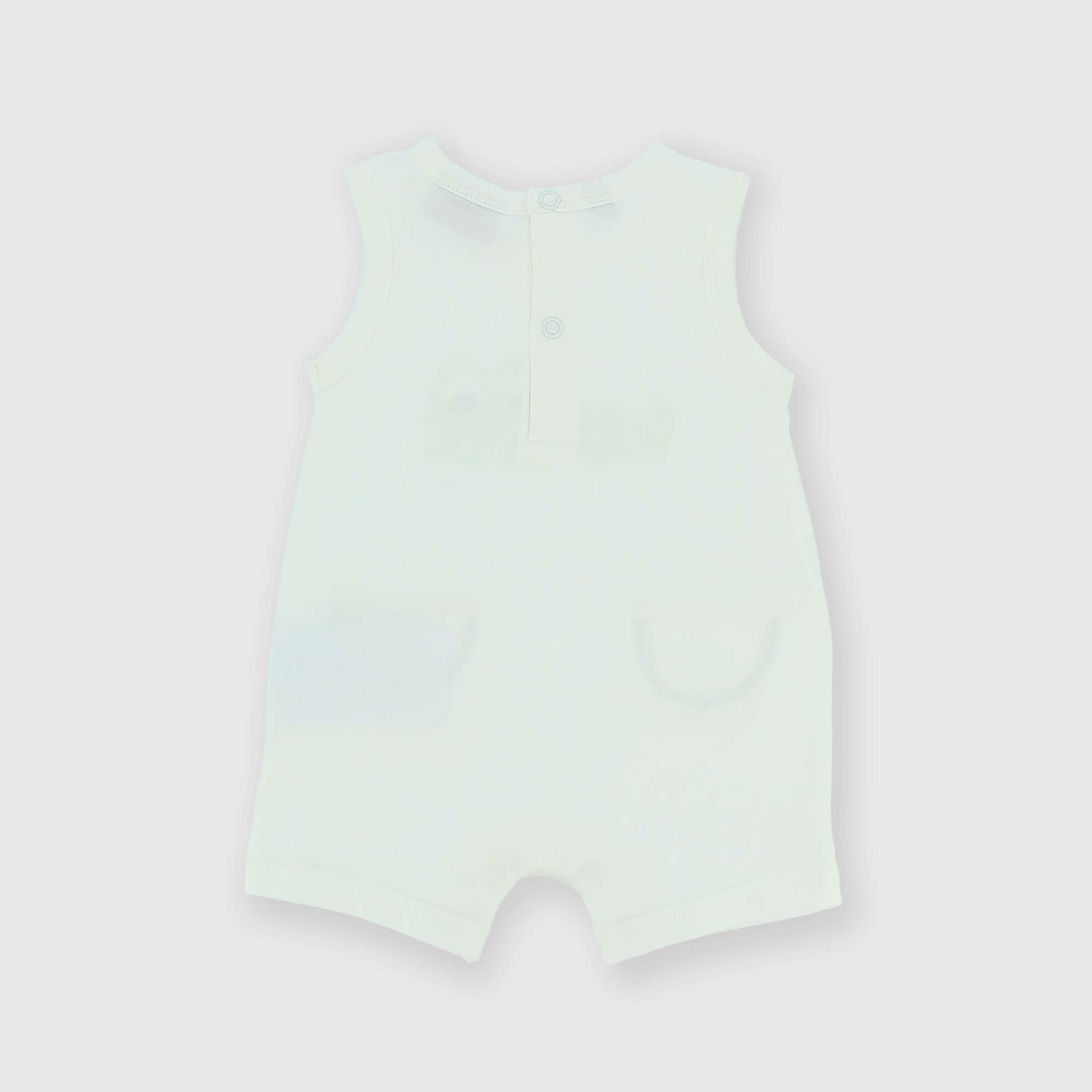 Strampler aus Jersey, Rundhalsausschnitt, ärmellos. Druckknöpfe am Rücken und im Schritt. Krokodil-Print auf der Vorderseite. Aufgesetzte Taschen.
