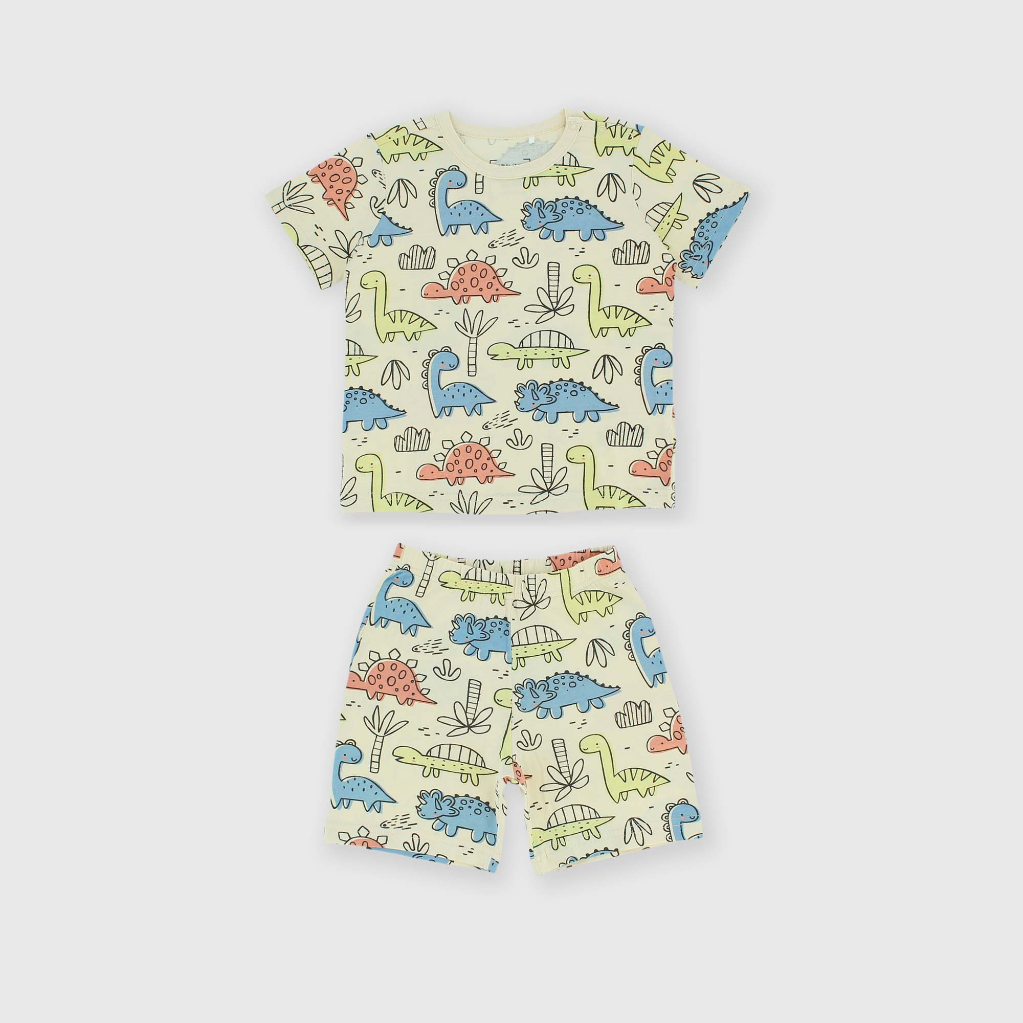 Pyjama-Set aus Jersey mit Dinosaurier-Allover-Print. Kurzärmeliges T-Shirt mit Rundhalsausschnitt und Druckknopfverschluss an der Schulter. Bermudashorts mit elastischem Bund.