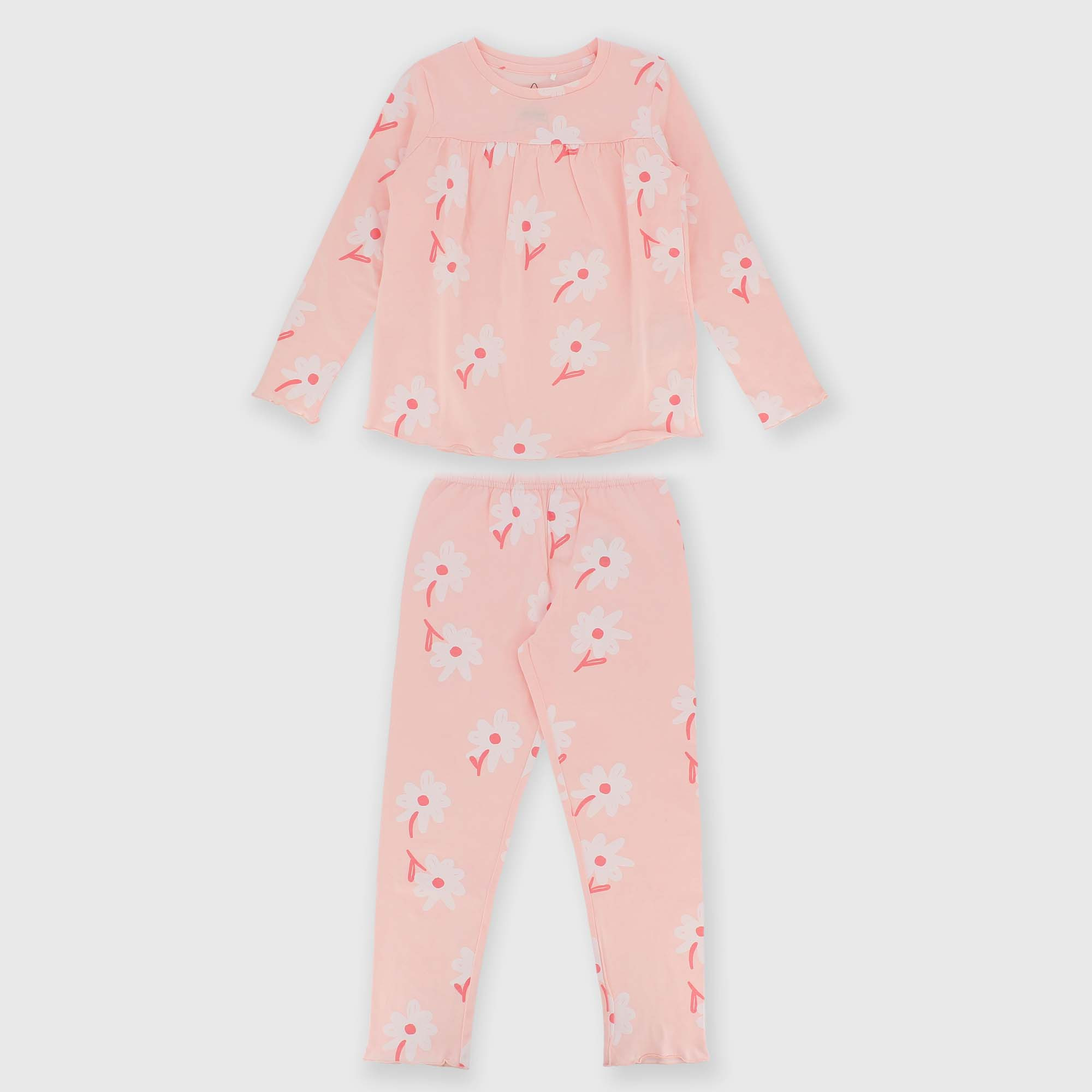 Pyjama-Set aus Jersey mit Allover-Blumenprint. Langärmeliges T-Shirt mit Rundhalsausschnitt. Hose mit elastischem Bund. Puppenstich-Finishes.
