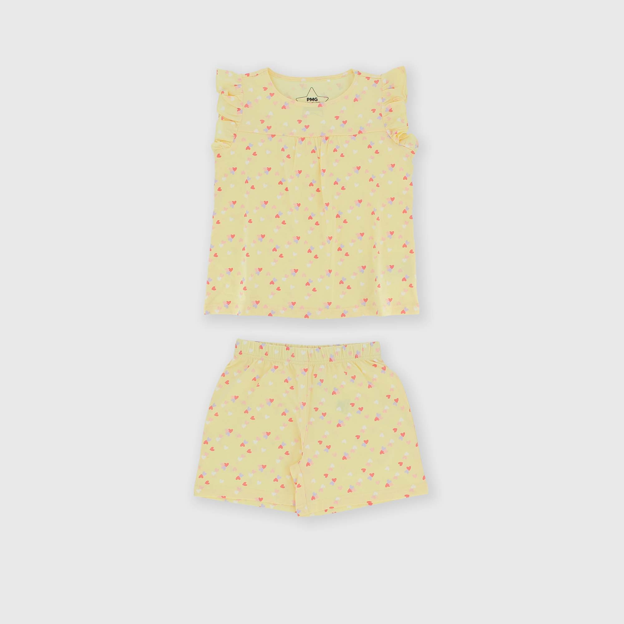 Pyjama-Set aus Jersey mit durchgehendem Herz-Print. Tanktop mit Rundhalsausschnitt und kleinen Rüschen an den Schultern. Shorts mit elastischem Bund.