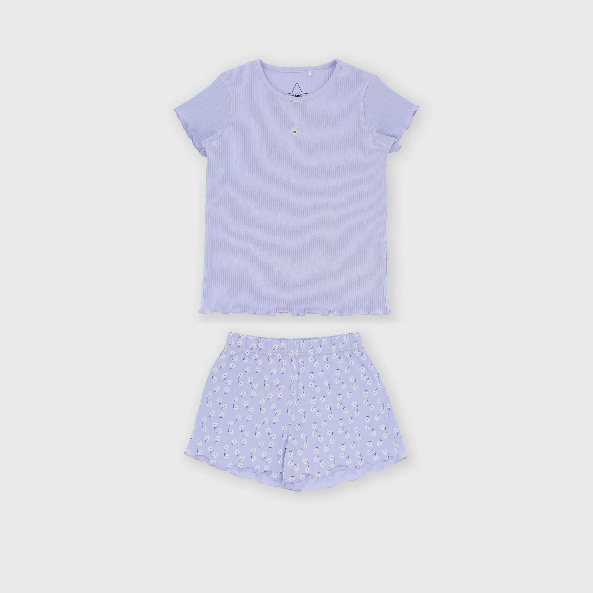 Pyjama-Set. Geripptes T-Shirt, Rundhalsausschnitt, kurze Ärmel. Druck auf der Vorderseite. Shorts aus Jersey mit elastischem Bund. Allover-Druck. Puppenstich-Finishes.