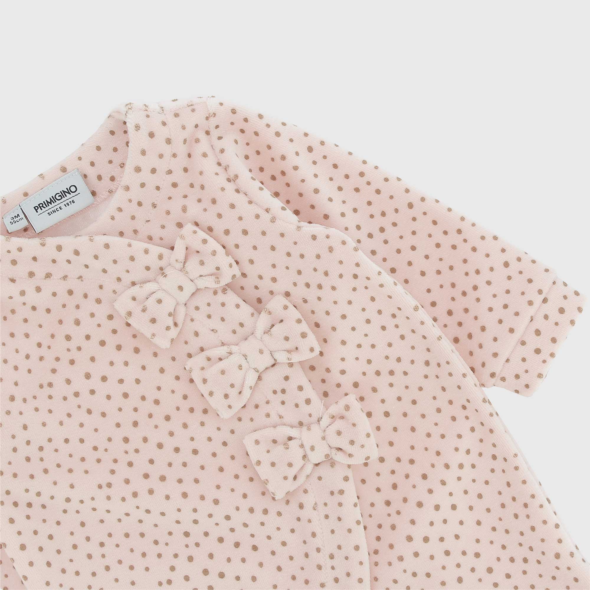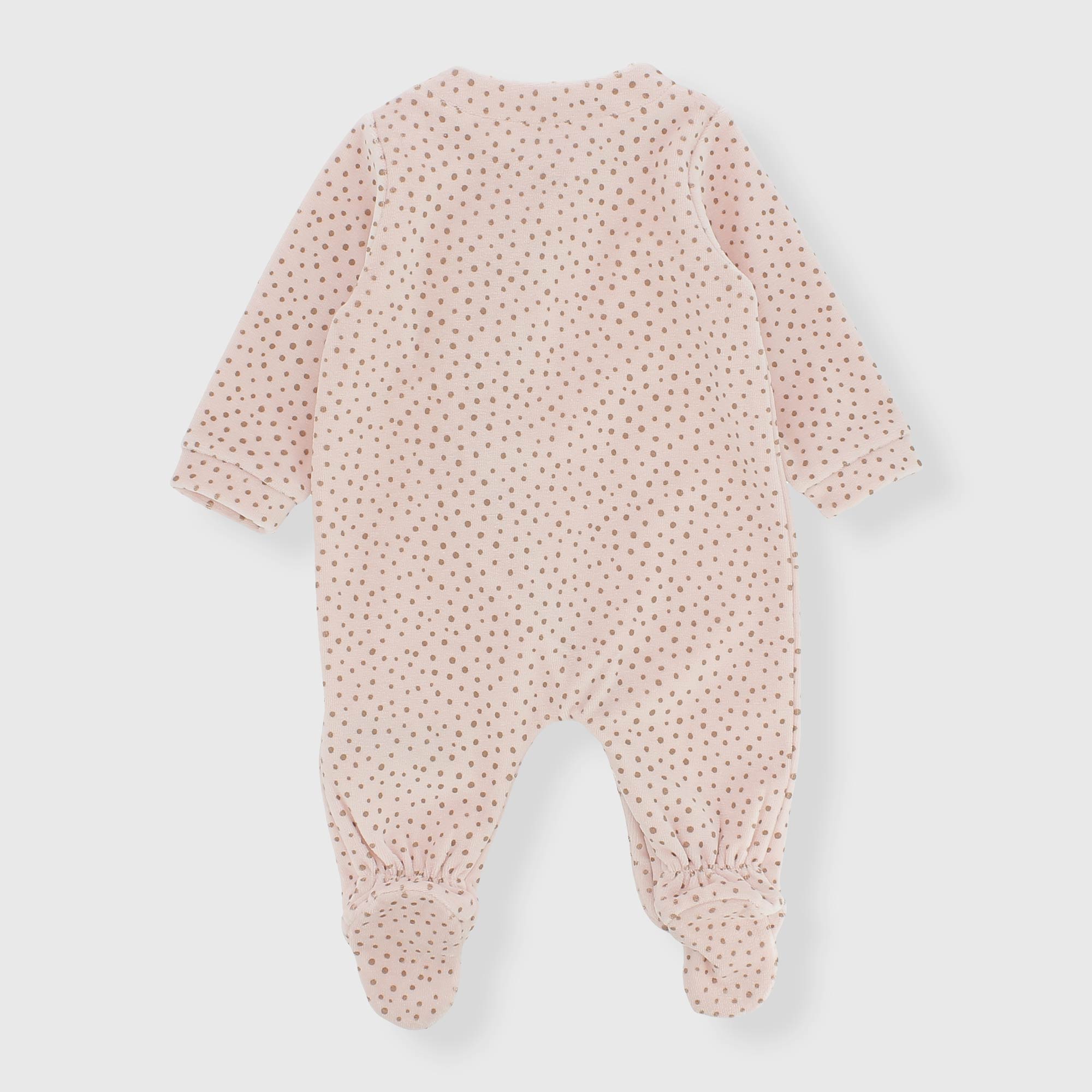 Chenille-Playsuit mit Rundhalsausschnitt und langen Ärmeln. Kimono-Verschluss mit automatischen Knöpfen. Allover-Punktmuster. Auf der Vorderseite angebrachte Schleifen.