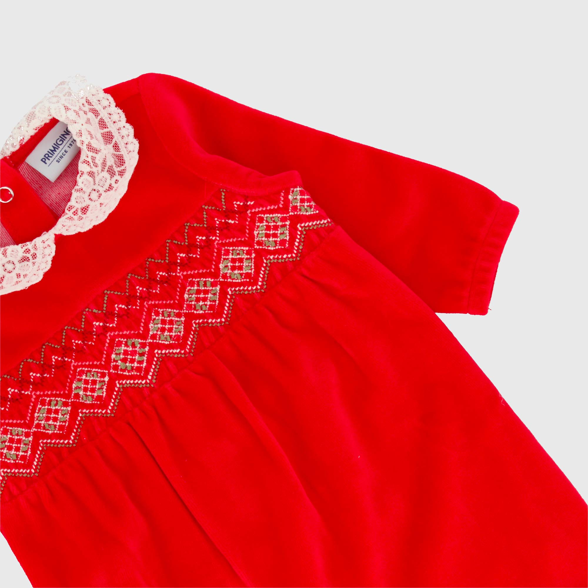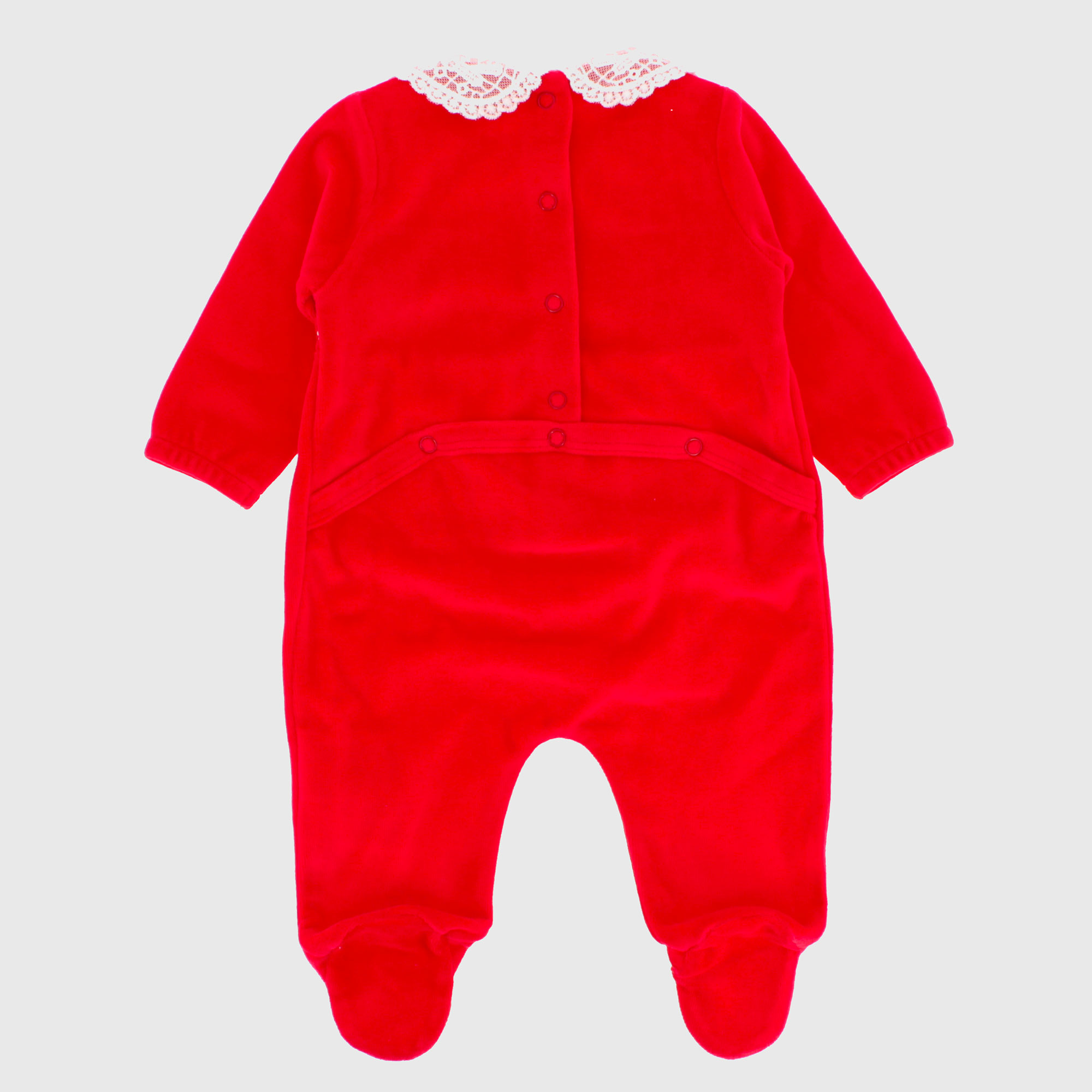Chenille-Anzug mit Spitzenkragen und langen Ärmeln. Verschluss mit automatischen Knöpfen auf der Rückseite. Intarsienstickerei auf der Vorderseite.