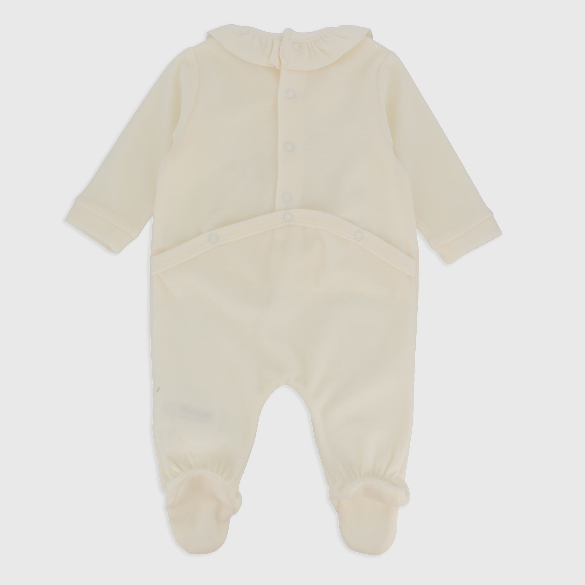 Chenille-Playsuit mit Rüschenkragen und langen Ärmeln. Verschluss mit automatischen Knöpfen auf der Rückseite. Druck auf der Vorderseite.