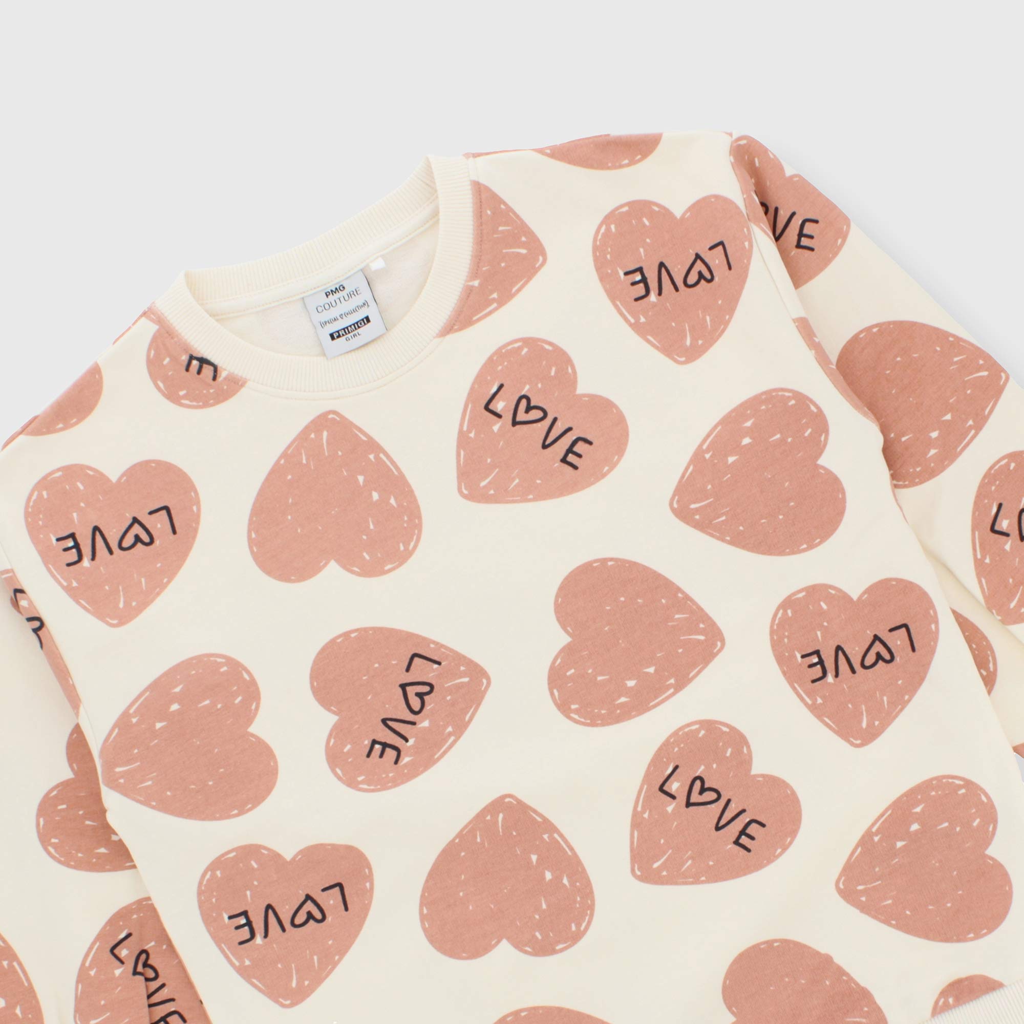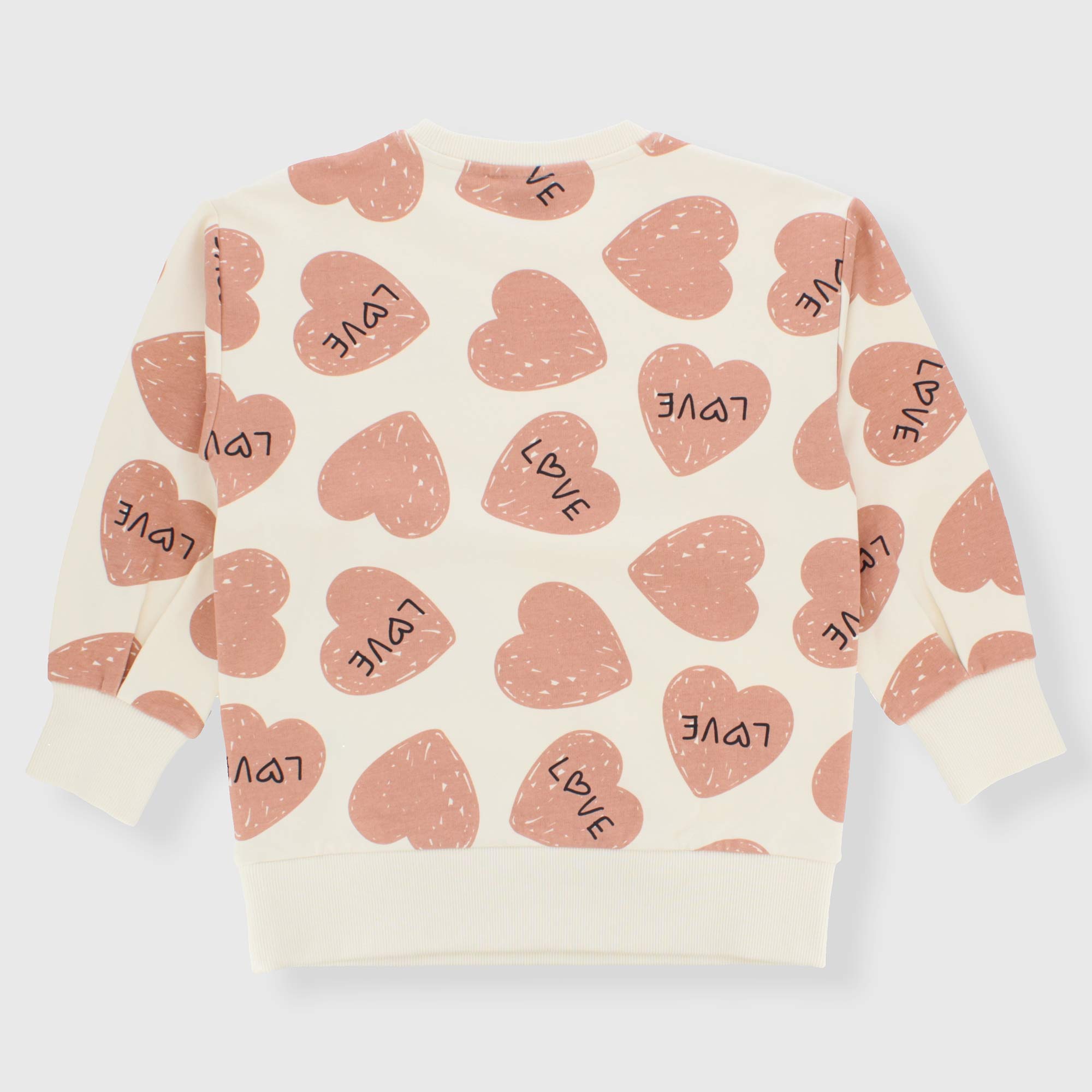 Felpa girocollo, a maniche lunghe. Stampa all-over con scritte e cuori.