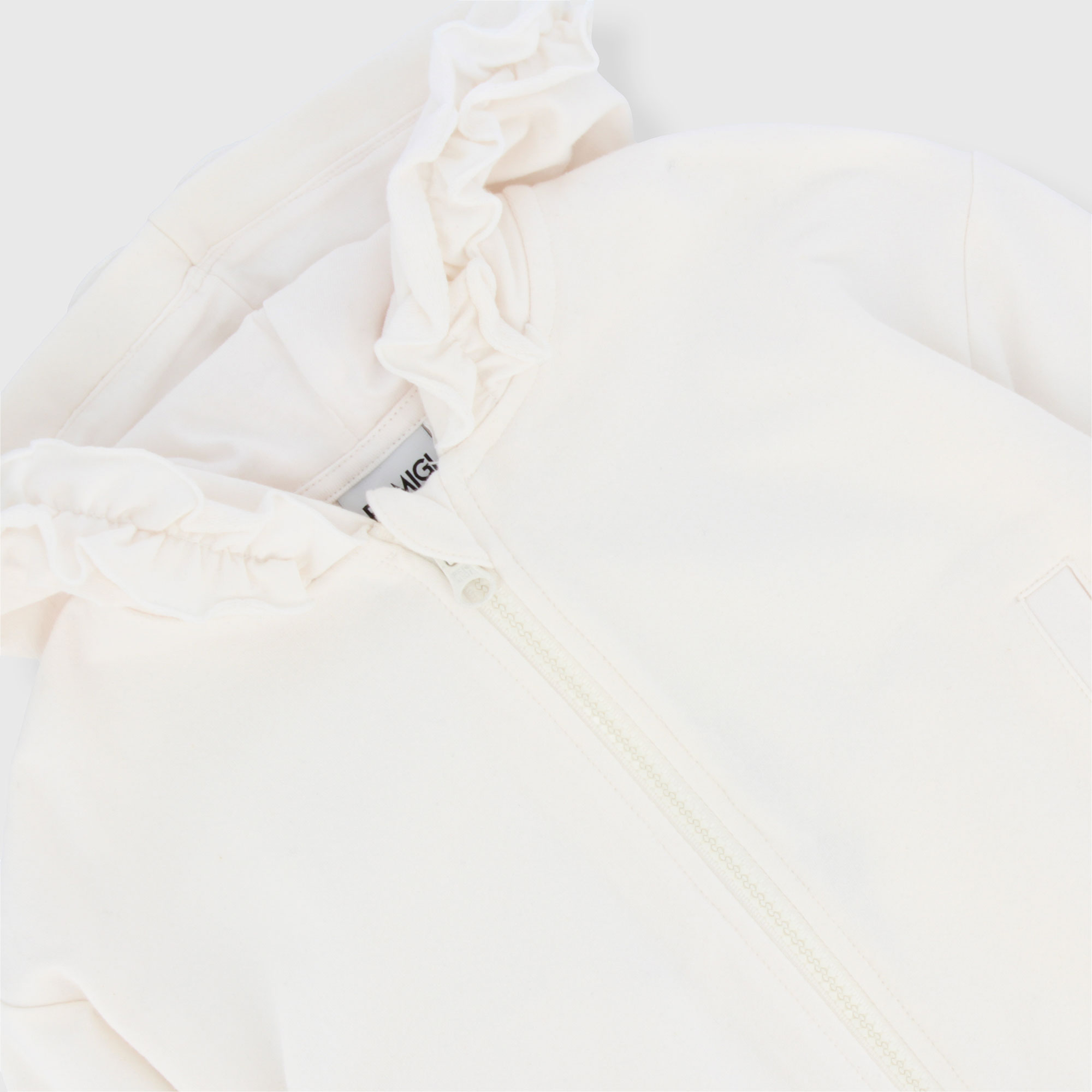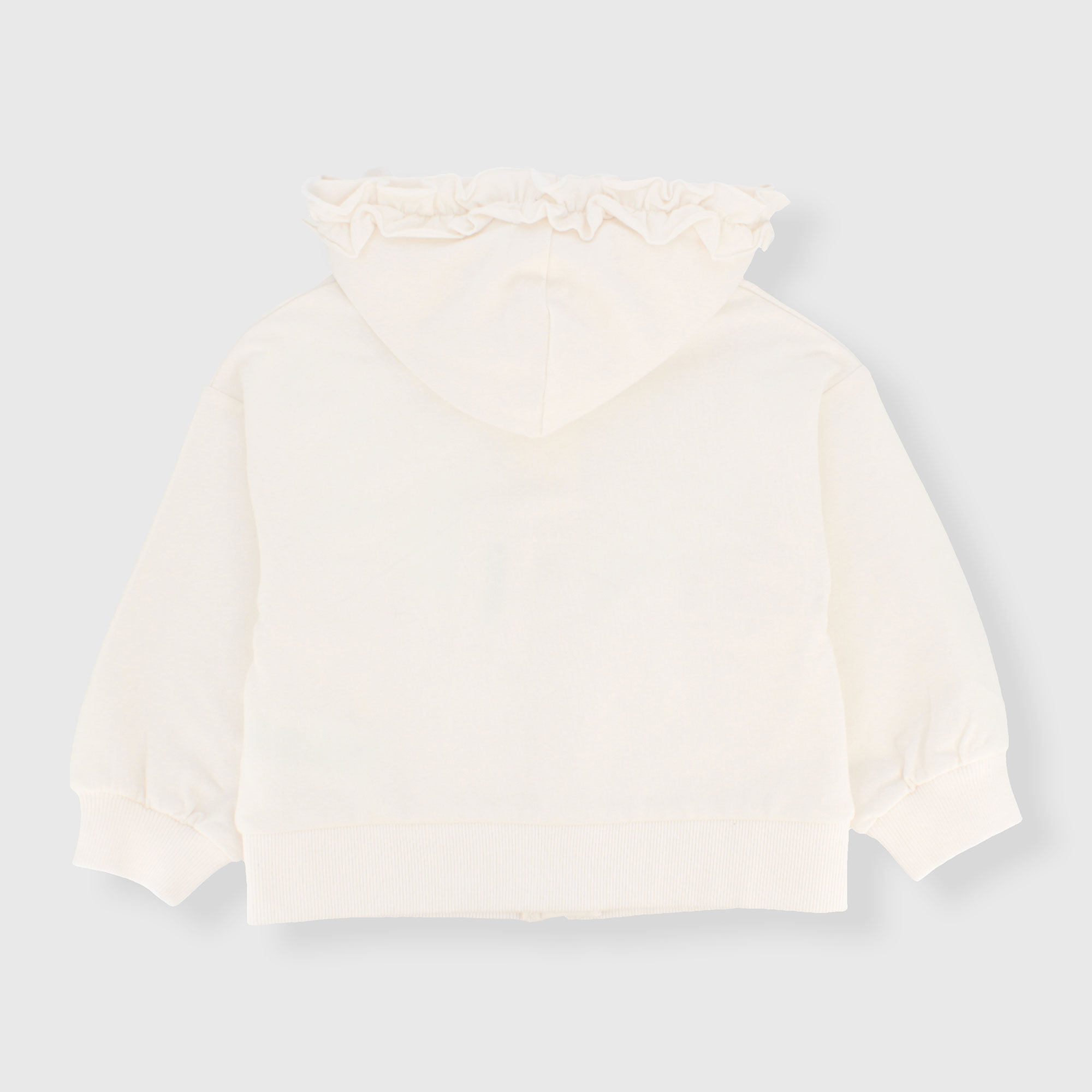 Offenes Kapuzensweatshirt mit langen Ärmeln. Reißverschluss vorne. Am Kapuzenrand applizierte Volants. Leistentaschen. Gerippte Bündchen und Saum.