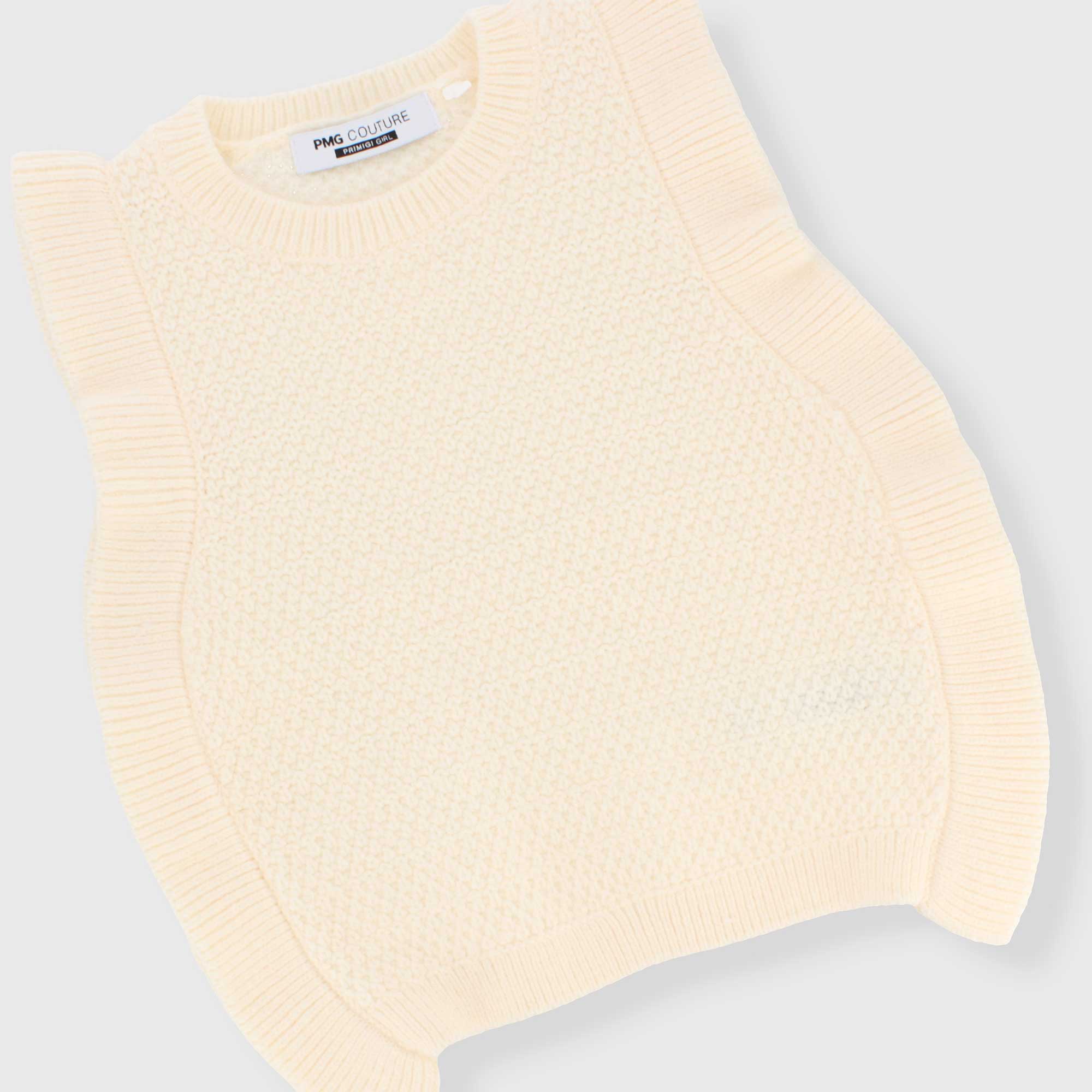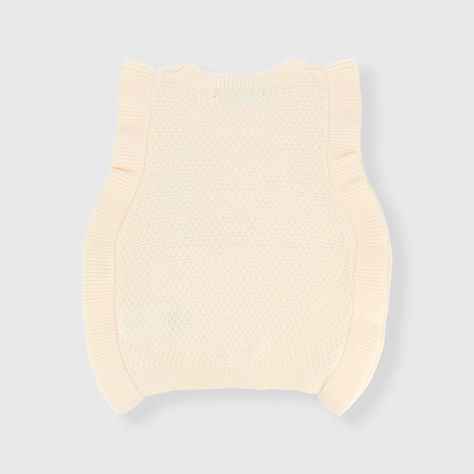 Weiche Strickweste, Rundhalsausschnitt. Rüschen an den Profilen.