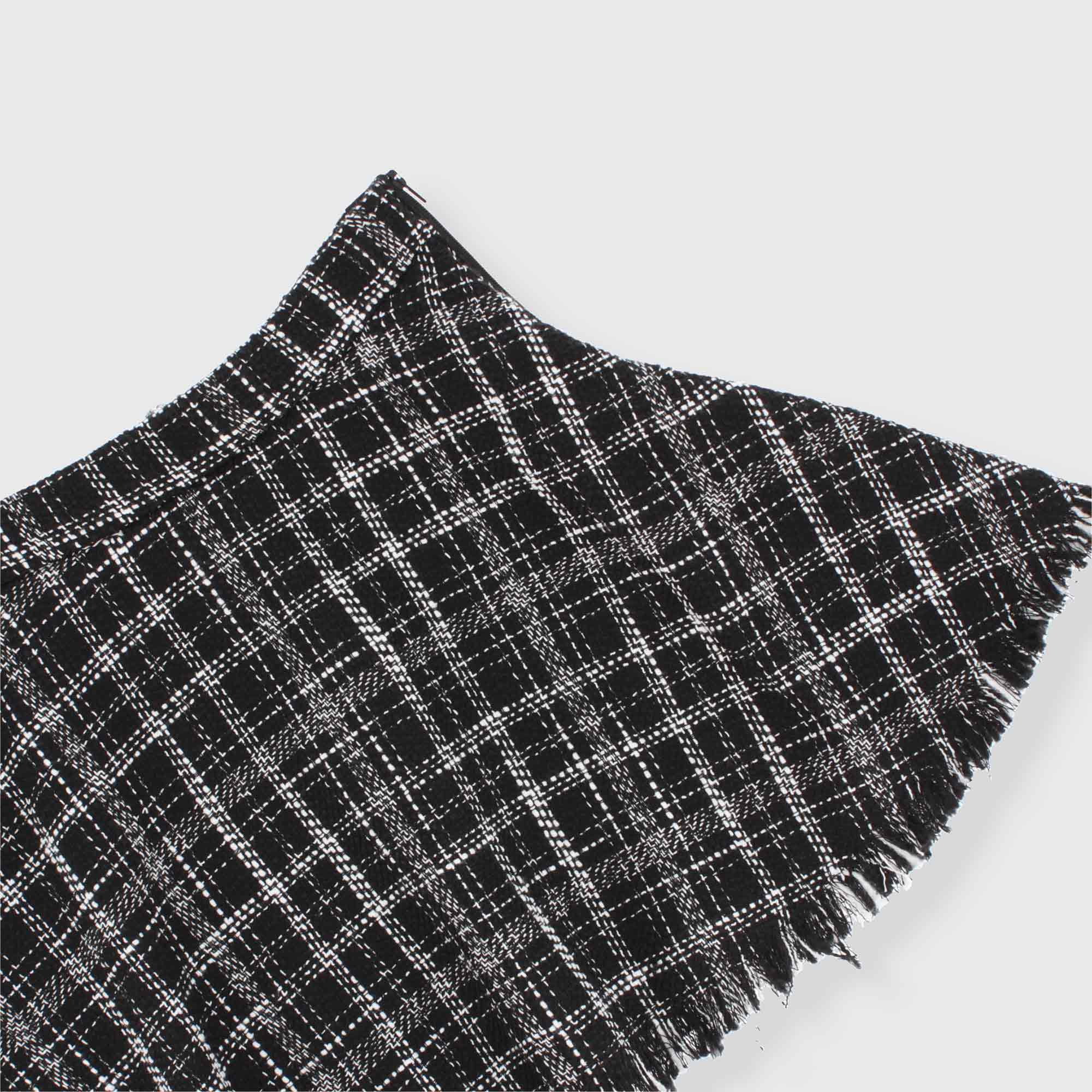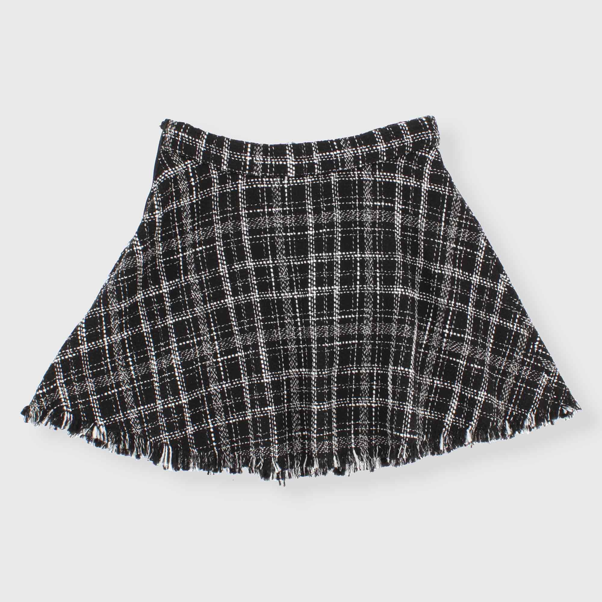 Rock aus Tweedstoff mit Fransen am Saum. Reißverschluss an der Seite. Innenfutter.