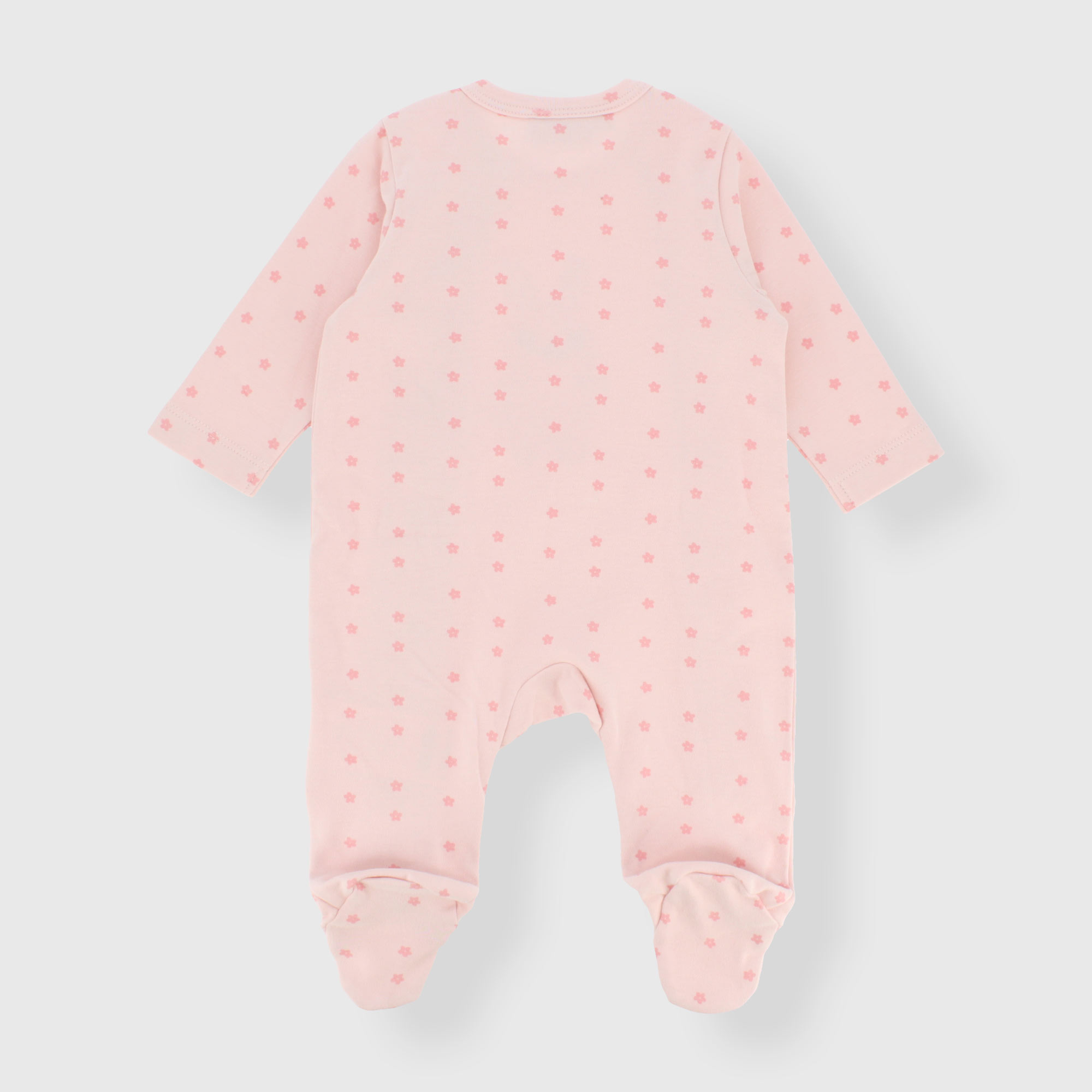 Interlock-Playsuit mit Rundhalsausschnitt und langen Ärmeln. Kimono-Verschluss mit automatischen Knöpfen. Allover-Blumendruck. Rüschen und gesticktes Häschen auf der Vorderseite.