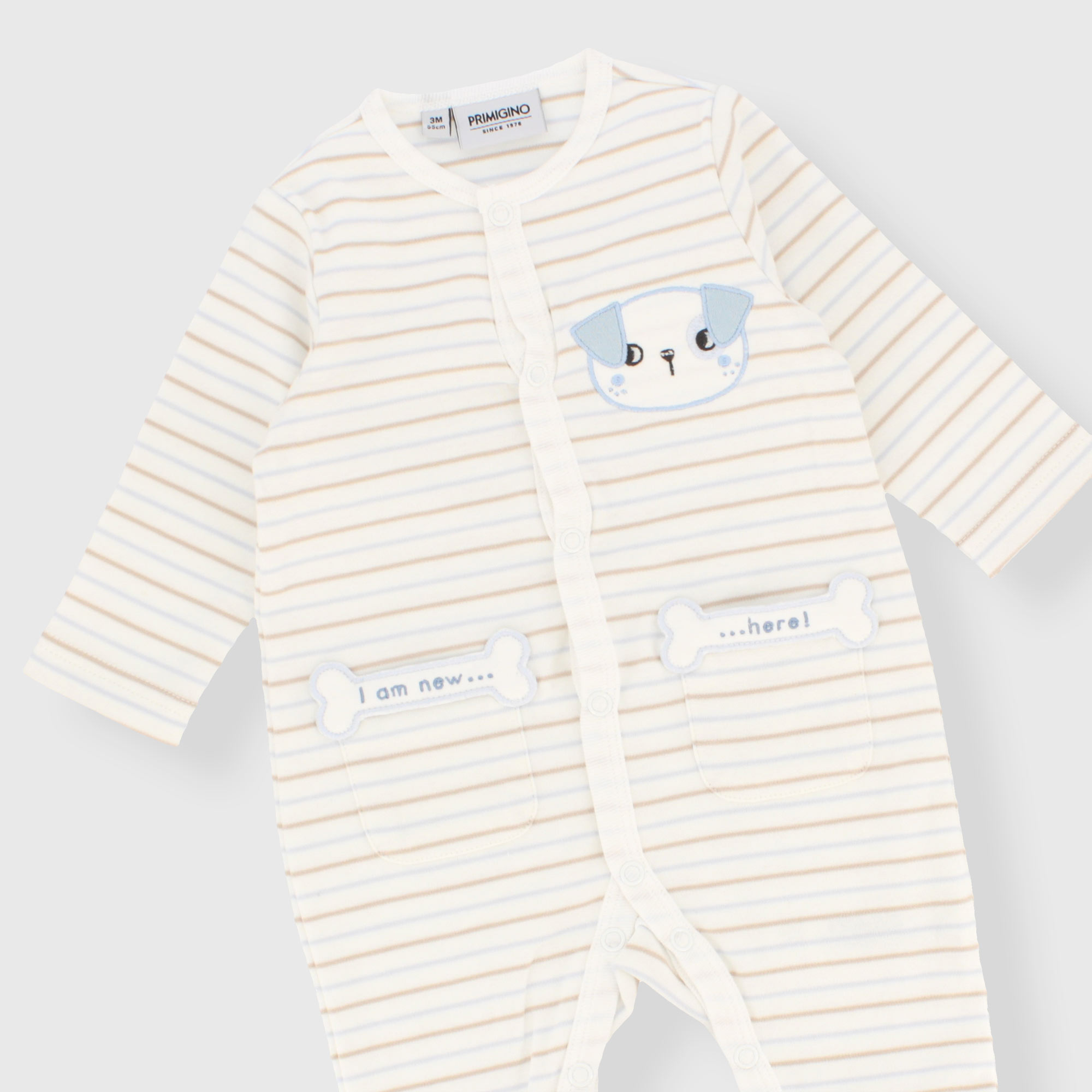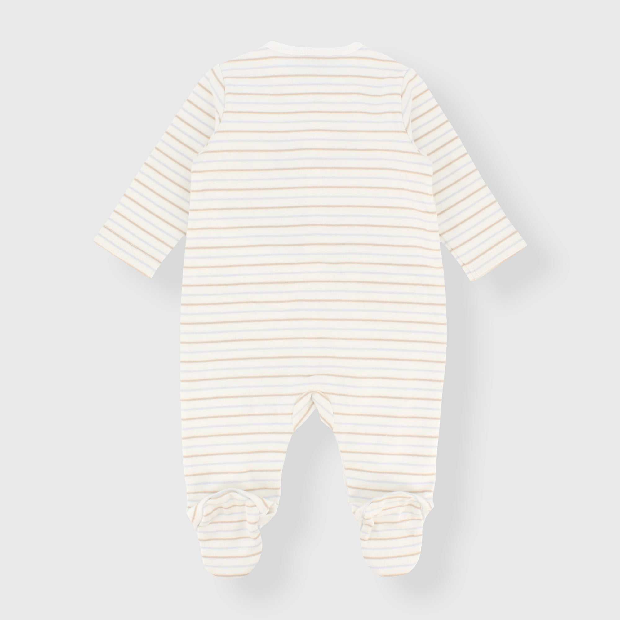 Interlock-Playsuit mit garngefärbten Streifen, Rundhalsausschnitt und langen Ärmeln. Vorderer Verschluss mit Druckknöpfen. Aufgesetzte Taschen und gestickte Applikationen auf der Vorderseite.
