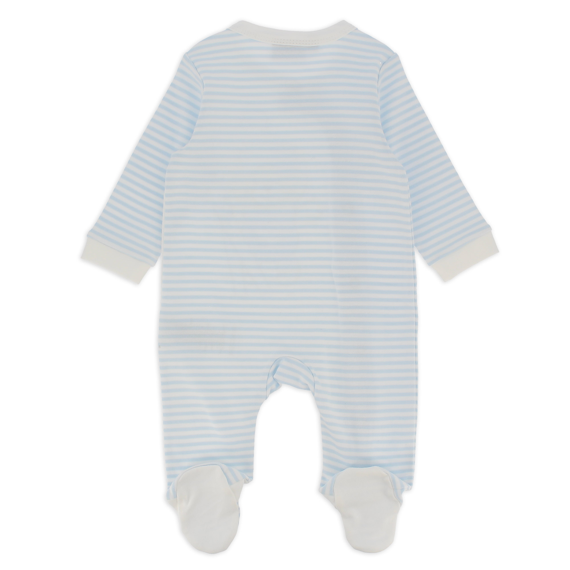 Interlockstrampler mit langen Ärmeln und Rundhalsausschnitt. Kimono-Verschluss mit Druckknöpfen. Alloverdruck mit Streifen und Teddybär auf der Vorderseite.