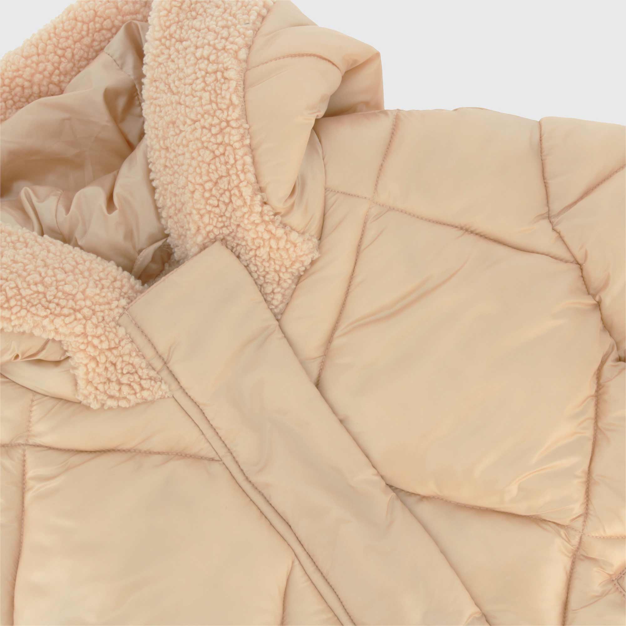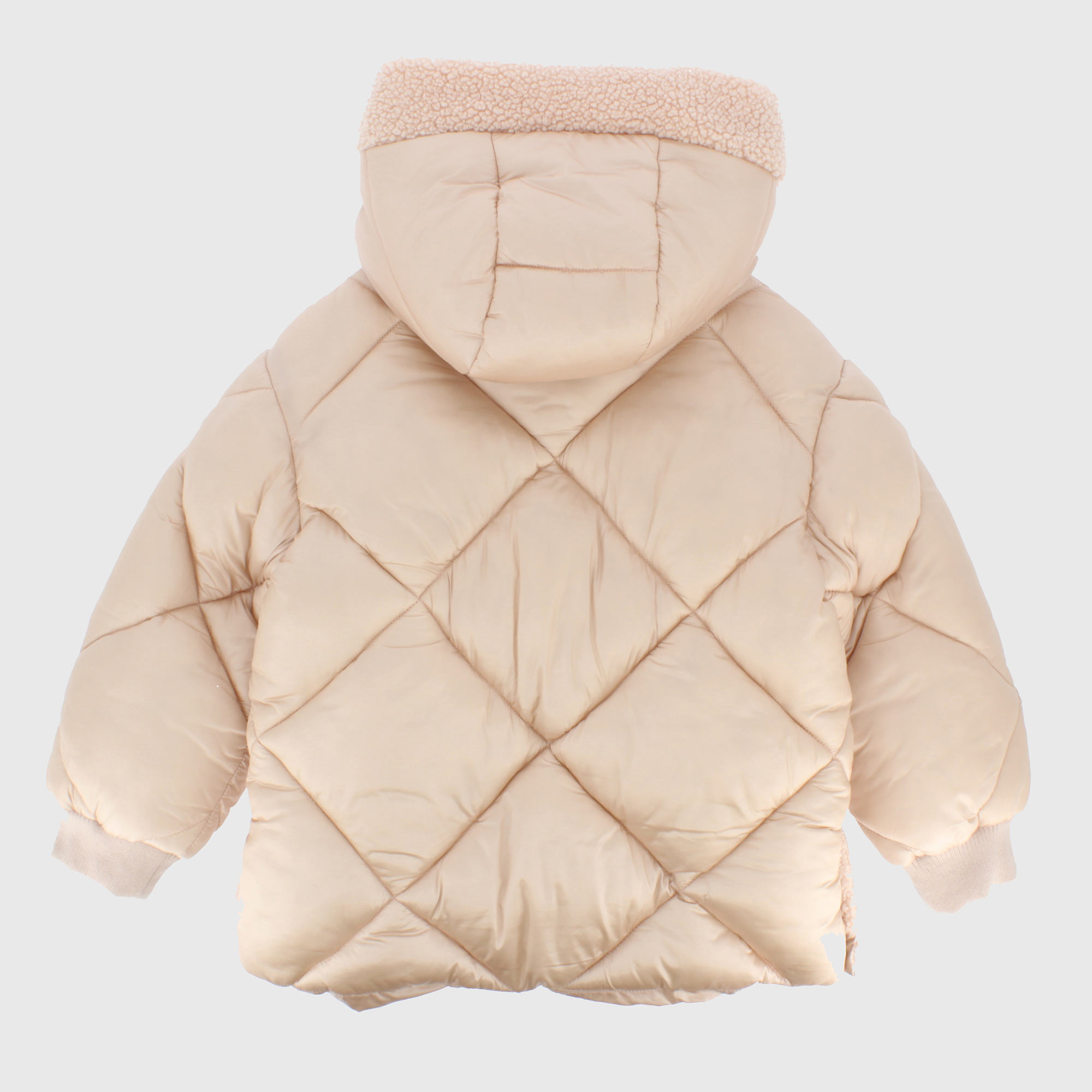 Jacke mit Kapuze, lange Ärmel. Reißverschluss und Druckknopfverschluss vorne. Seitentaschen mit Reißverschluss. Innenfutter aus Kunstfell mit Teddyeffekt. Gerippte Bündchen und Seitenschlitze mit Knöpfen.