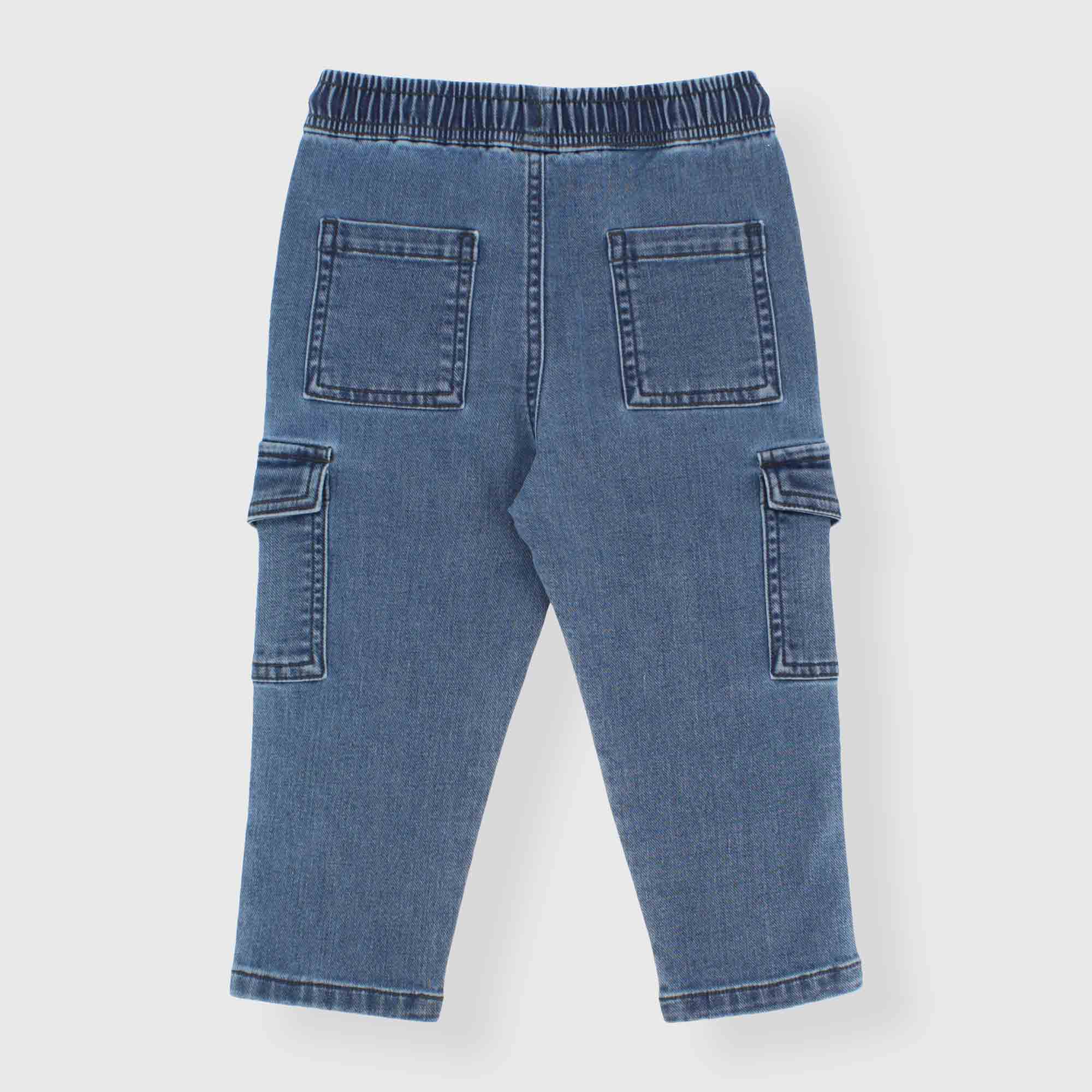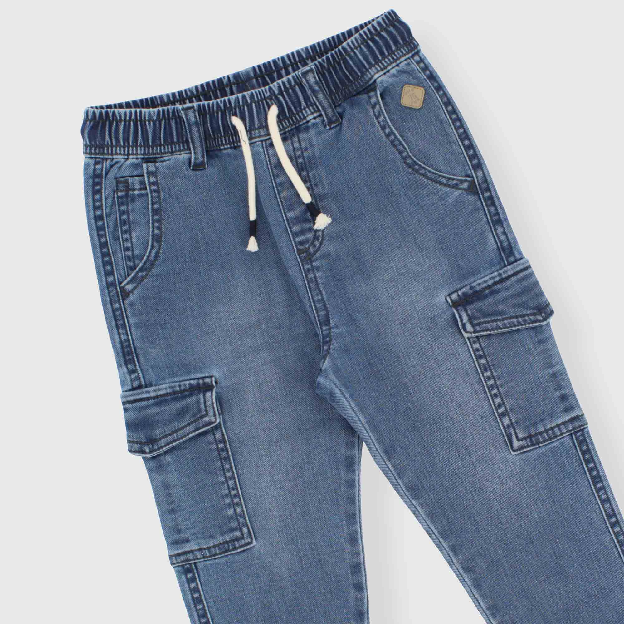Jeanshose mit elastischem Bund und Schnürsenkeln vorne. Große aufgesetzte Taschen mit Patte an den Seiten. Kleiner Logo-Patch auf der Vorderseite.