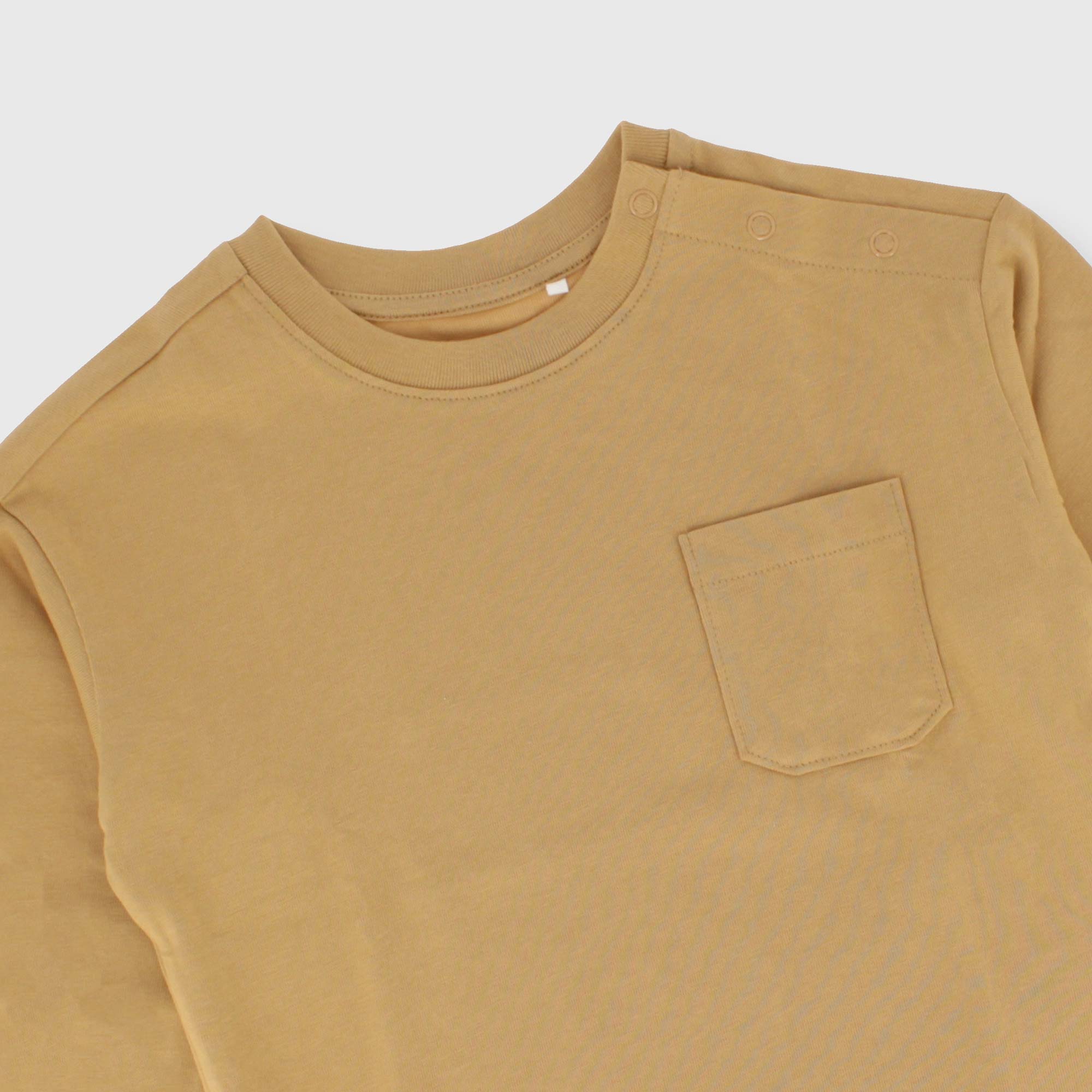 Jersey-T-Shirt, Rundhalsausschnitt, lange Ärmel. Druckknopfverschluss an der Schulter. Aufgesetzte Tasche auf der Brust.