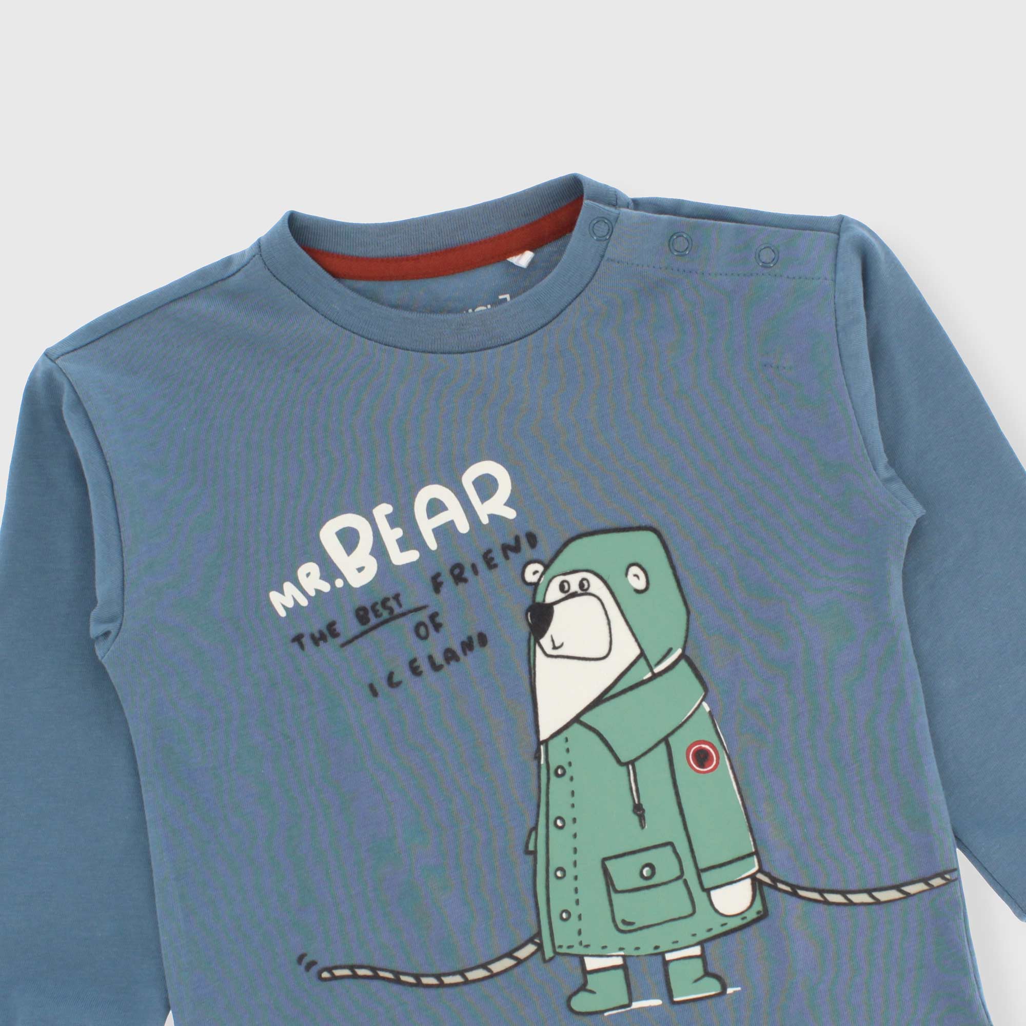 Jersey-T-Shirt, Rundhalsausschnitt, lange Ärmel. Druckknopfverschluss an der Schulter. Druck mit Details in Samtoptik auf der Vorderseite. Kragen und Bündchen gerippt.