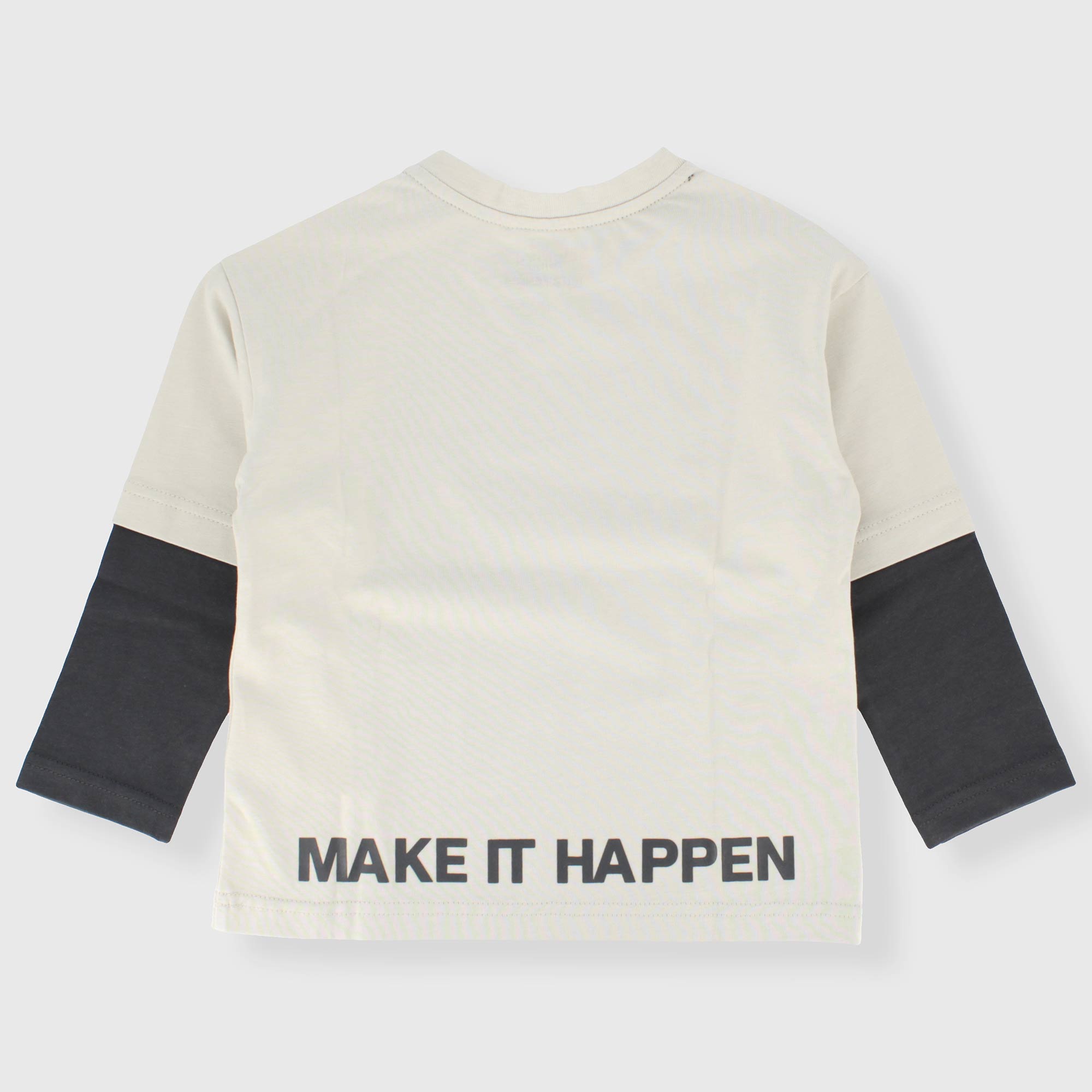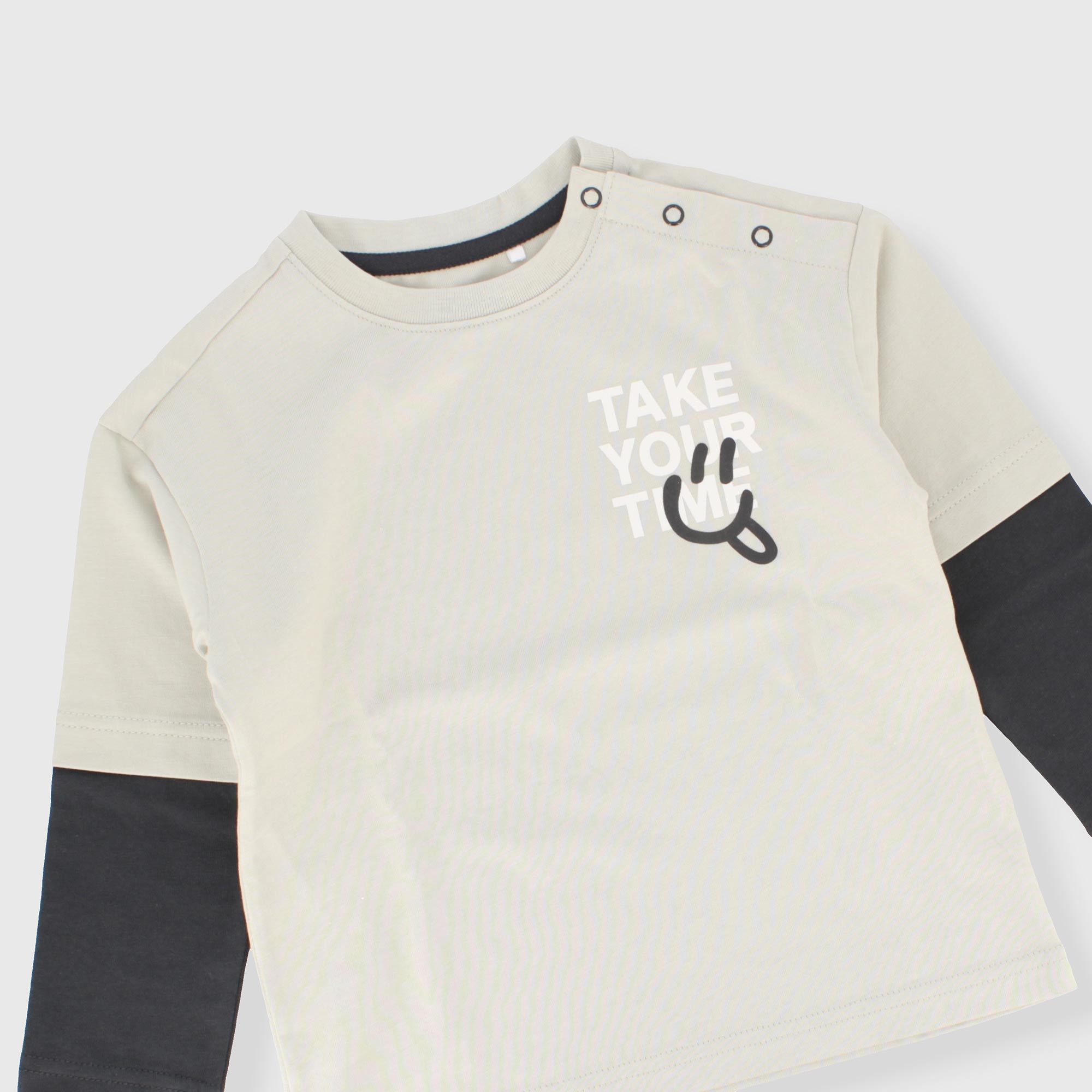 Jersey-T-Shirt, Rundhalsausschnitt, lange Ärmel. Druckknopfverschluss an der Schulter. Drucke mit Gummieffekt auf der Vorder- und Rückseite. Kontrastierende Doppelärmel.