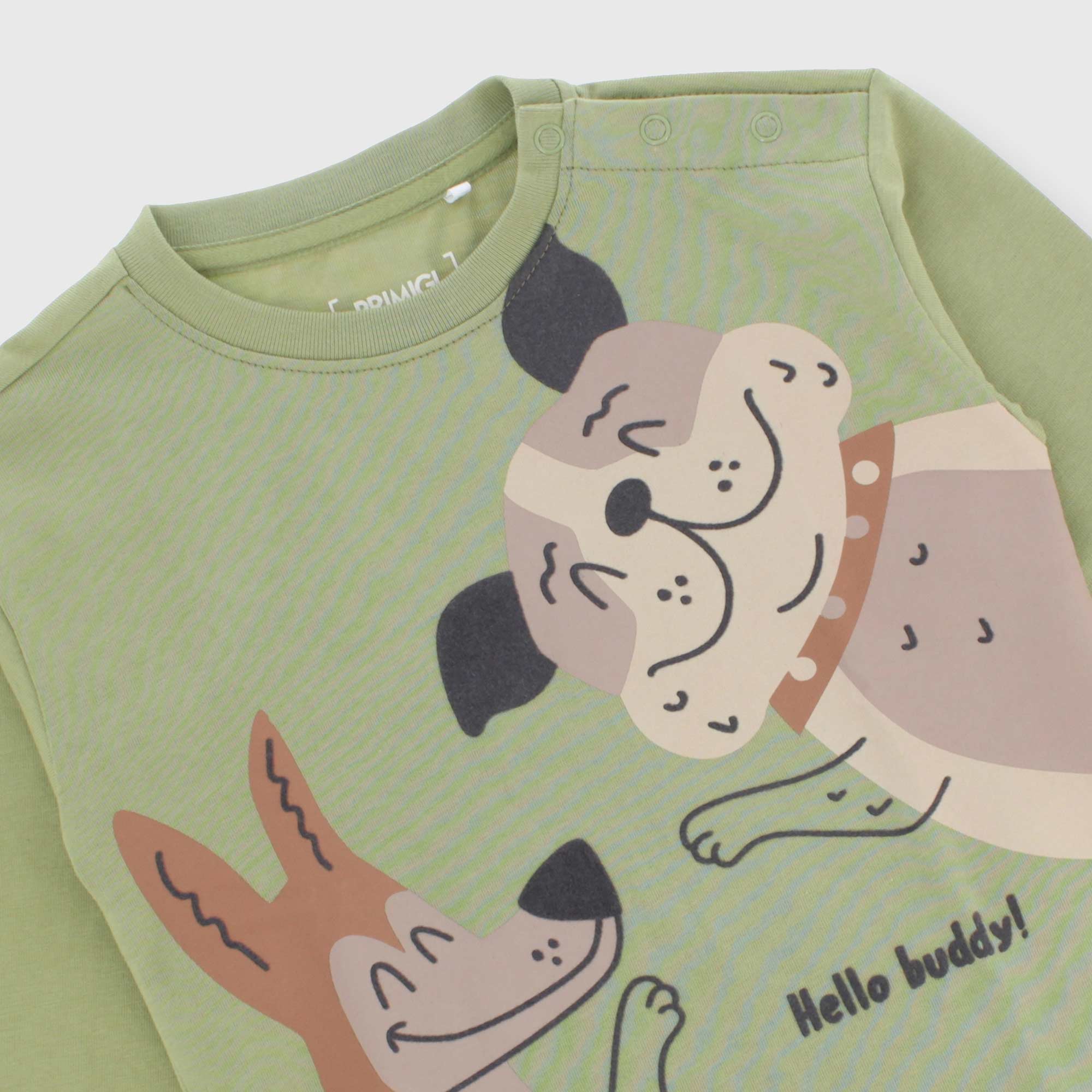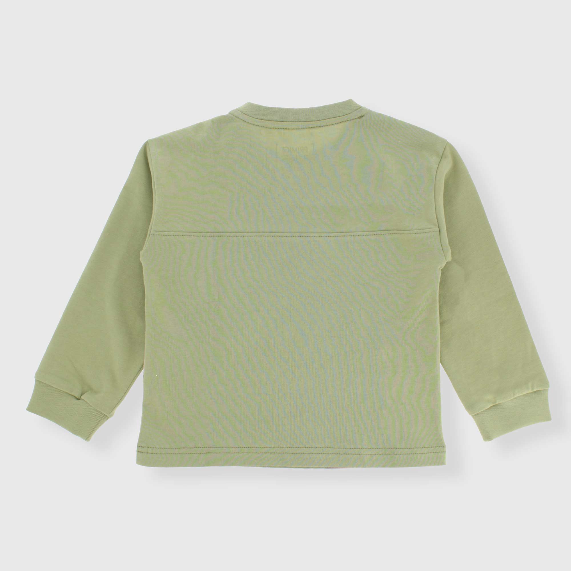 Jersey-T-Shirt, Rundhalsausschnitt, lange Ärmel. Druckknopfverschluss an der Schulter. Druck auf der Vorderseite. Kragen und Bündchen gerippt.