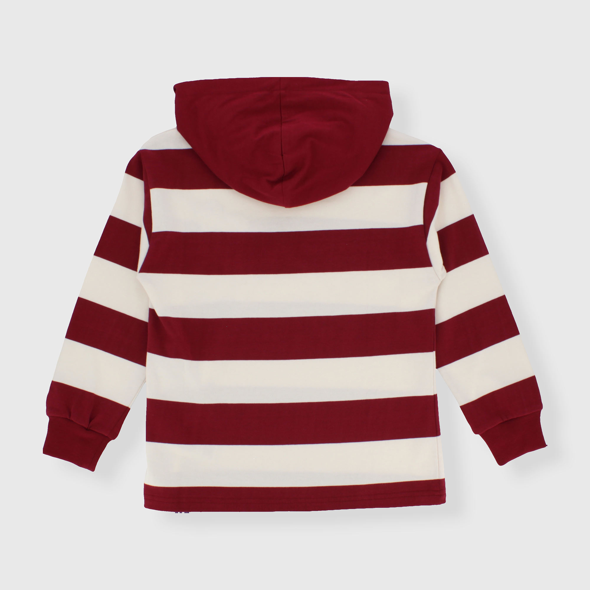 Garngefärbtes, gestreiftes Jersey-T-Shirt mit Kapuze und langen Ärmeln. Druck und Patch auf der Vorderseite. Gerippte Bündchen.