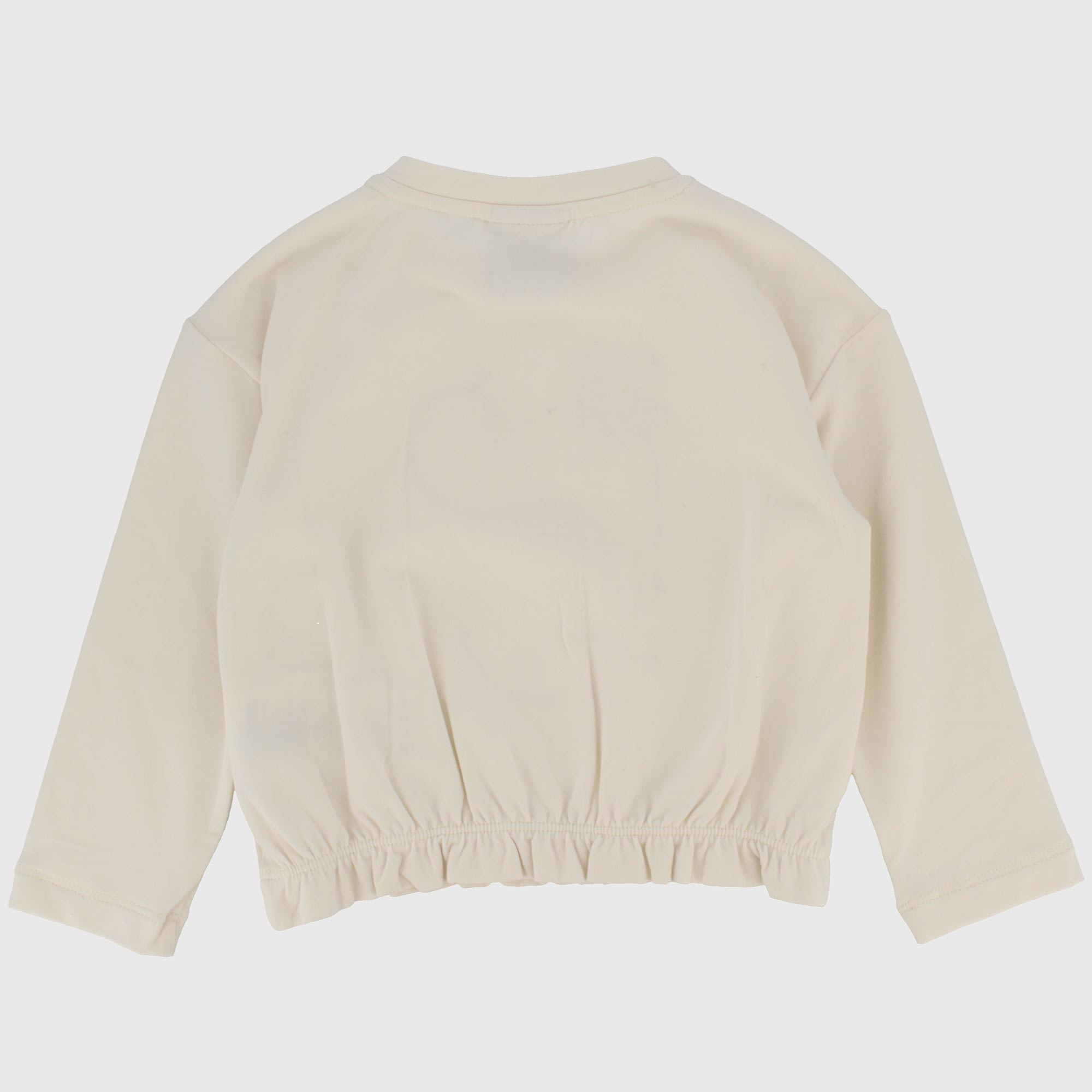 T-Shirt aus Stretch-Jersey, Rundhalsausschnitt, lange Ärmel. Druckknopfverschluss an der Schulter. Druck auf der Vorderseite. Geraffter Saum mit Gummizug.