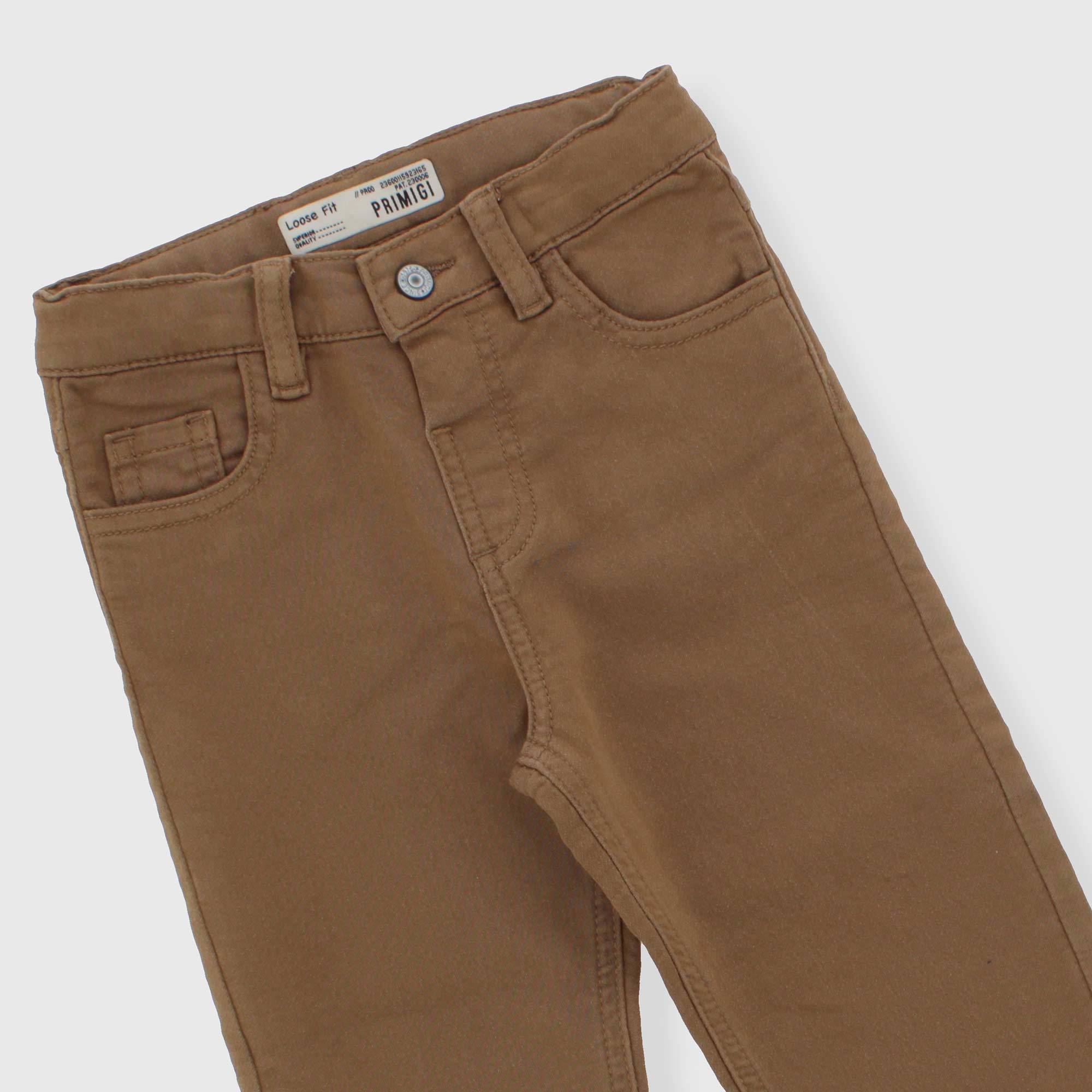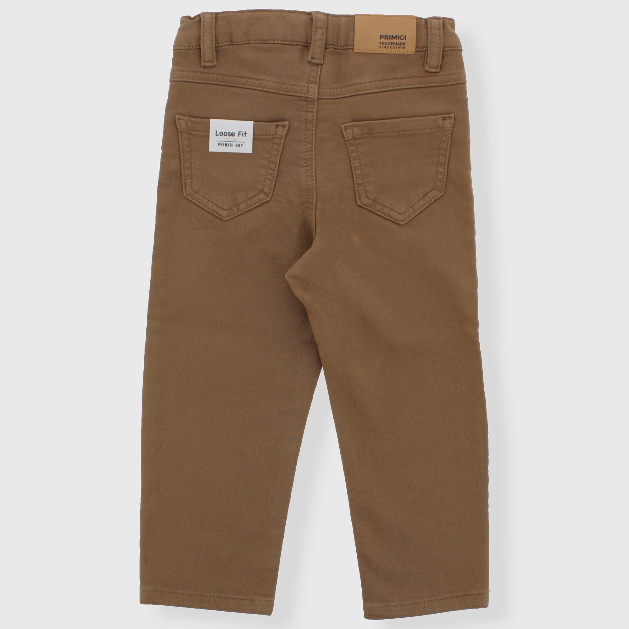 Hose aus farbigem Stretchstoff mit verstellbarer Innentaille. Druckknopfverschluss. Fünf Taschen. Lockere Passform.