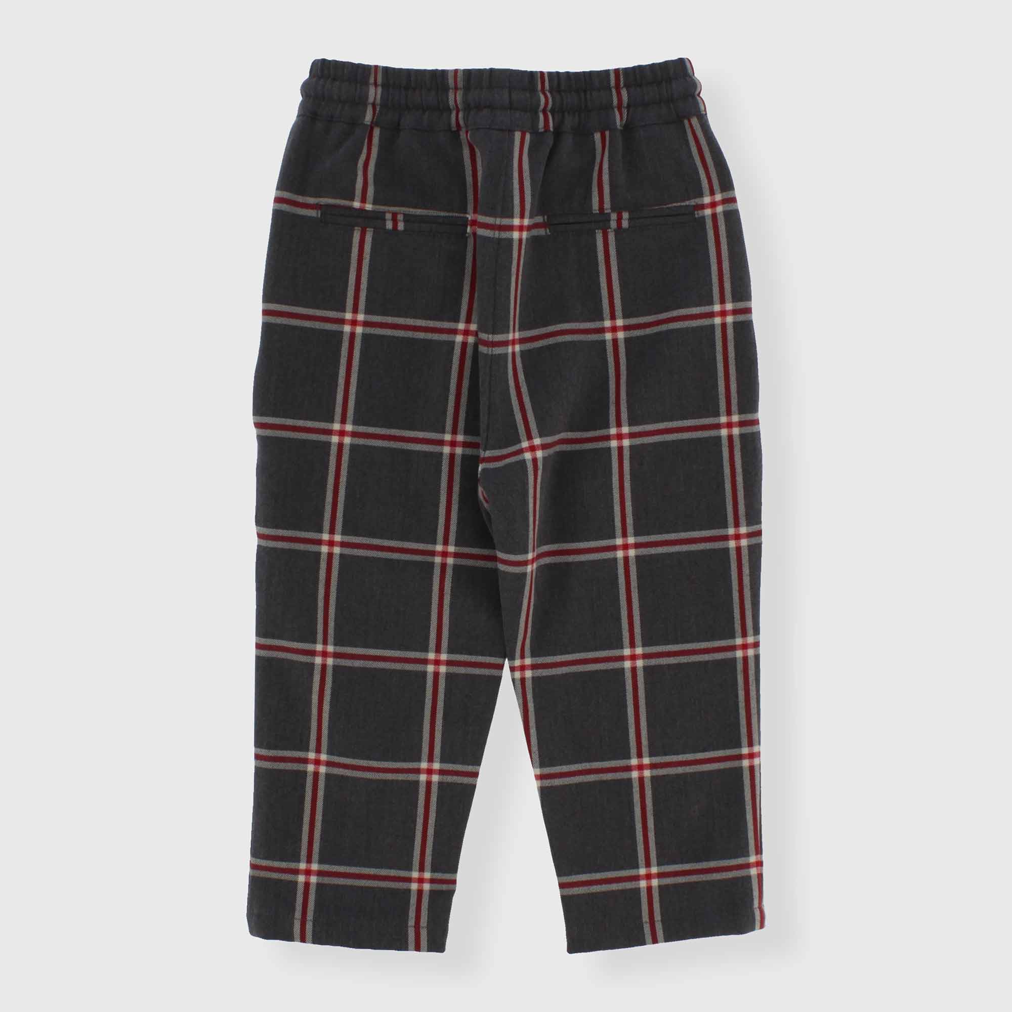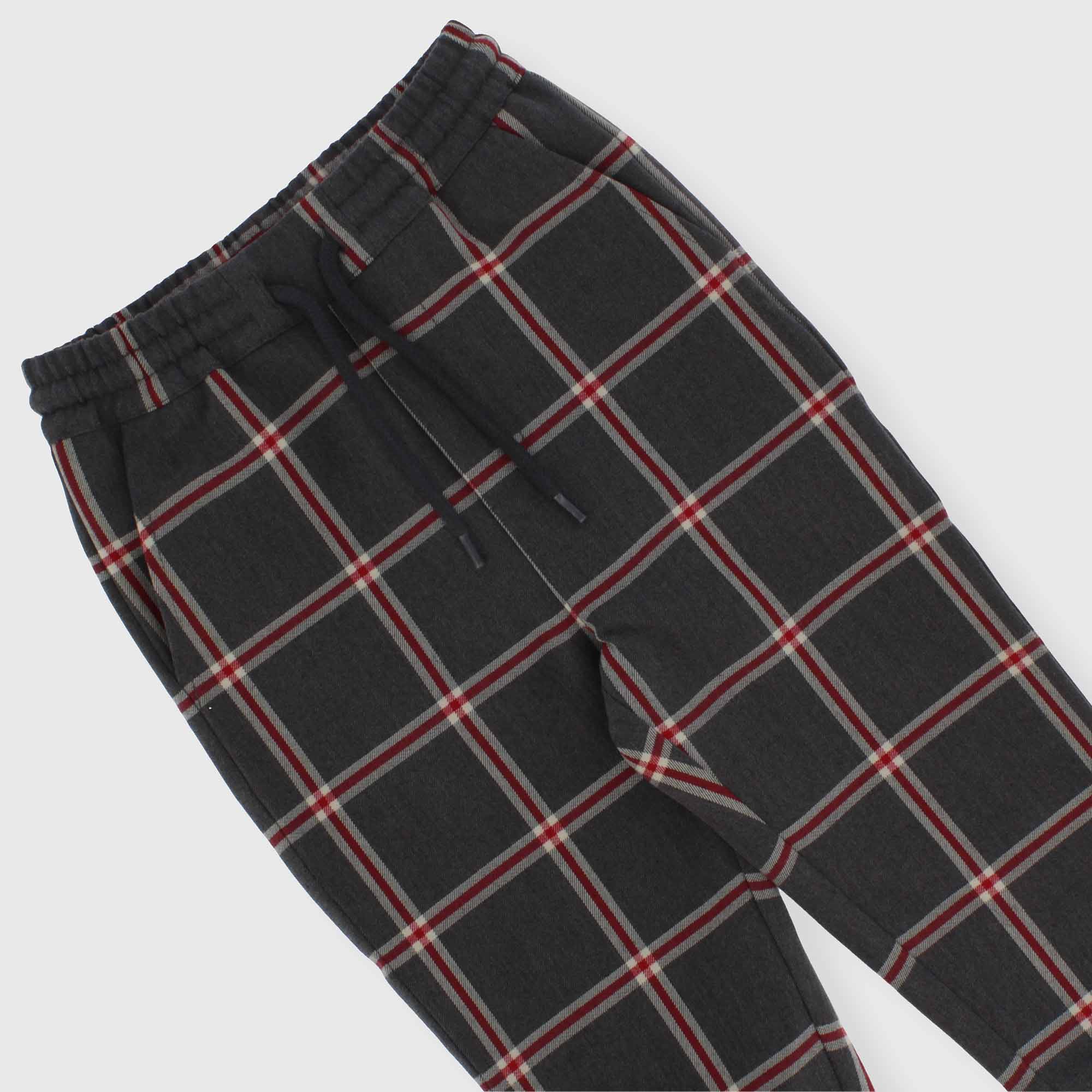 Hose aus kariertem Stoff mit elastischem Bund und Schnürsenkeln vorne. Französische Taschen vorne und Leistentaschen hinten.