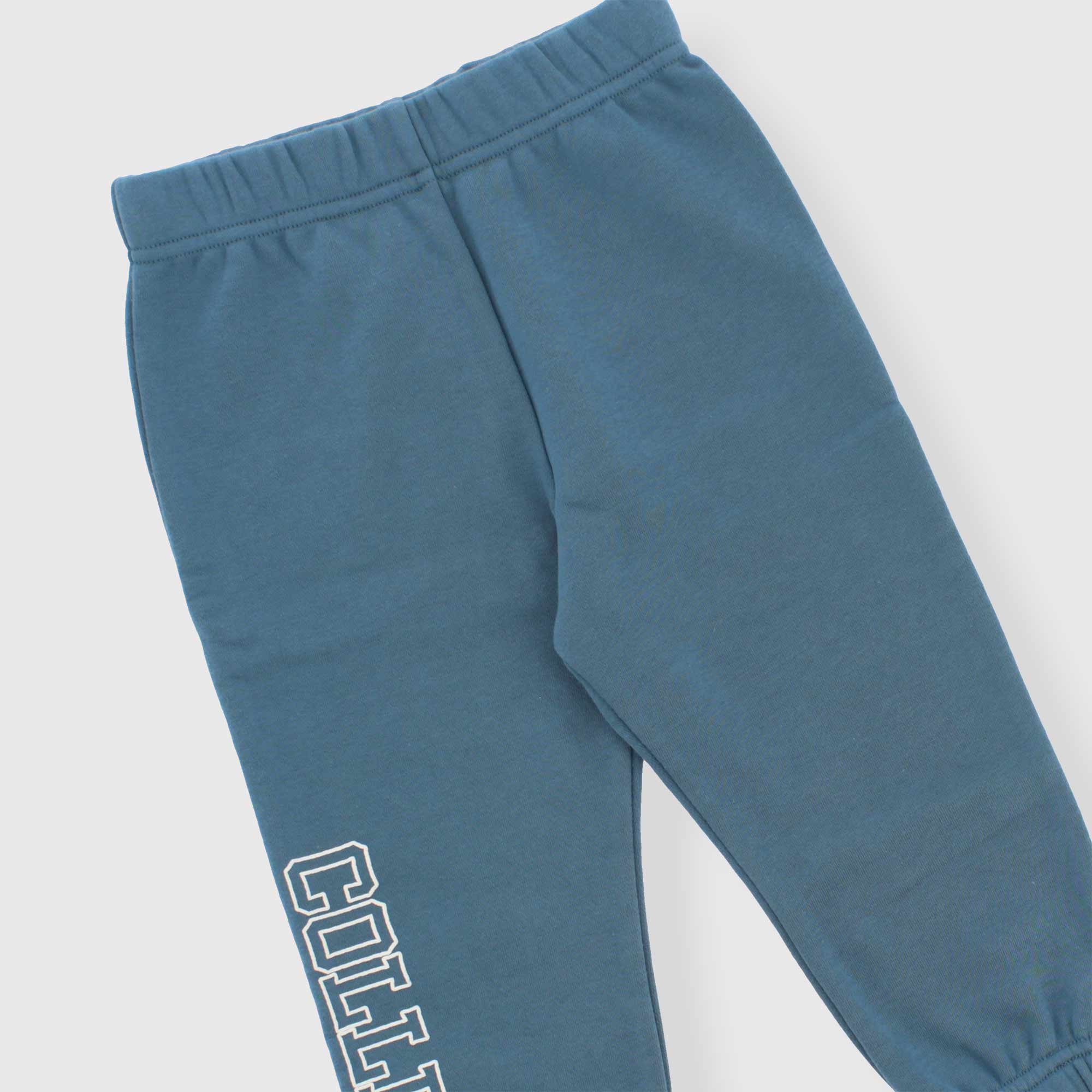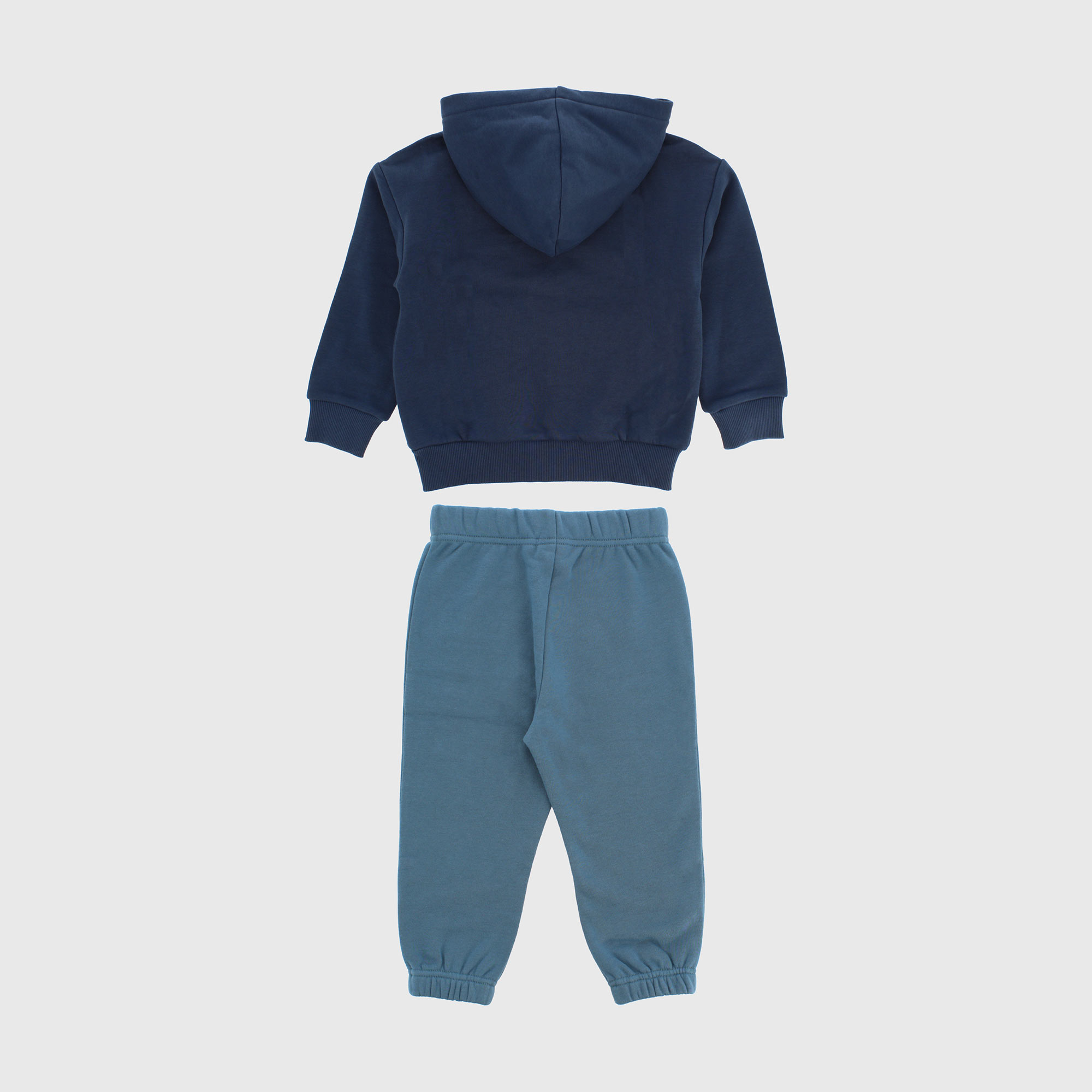 Trainingsanzug mit weich gebürsteter Innenseite, bestehend aus zwei Teilen. Kapuzenpullover, lange Ärmel. Reißverschluss vorne. Kängurutasche und Druck auf der Vorderseite. Sweatshirt-Hose mit elastischem Bund und Aufdruck am Bein. Elastischer Boden.