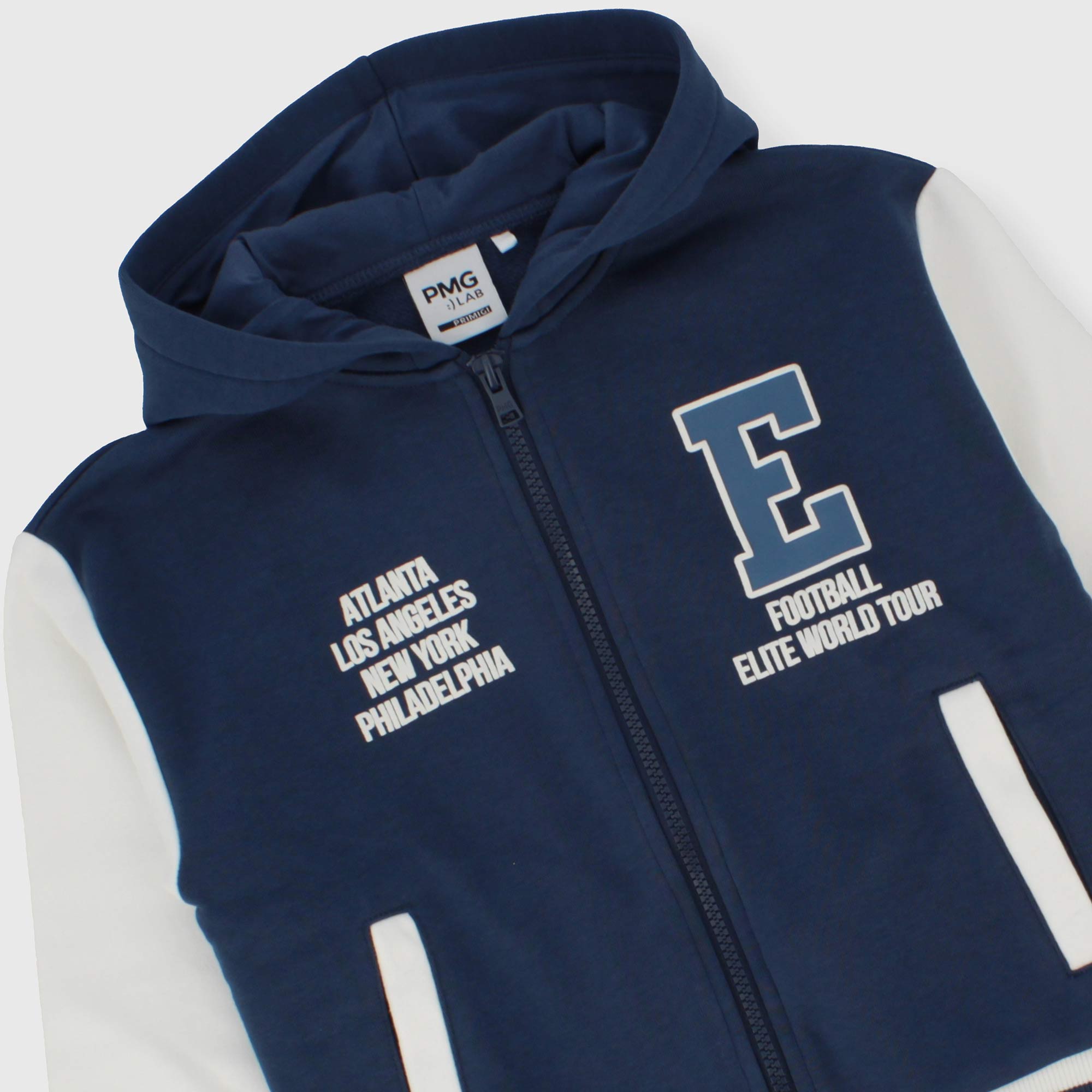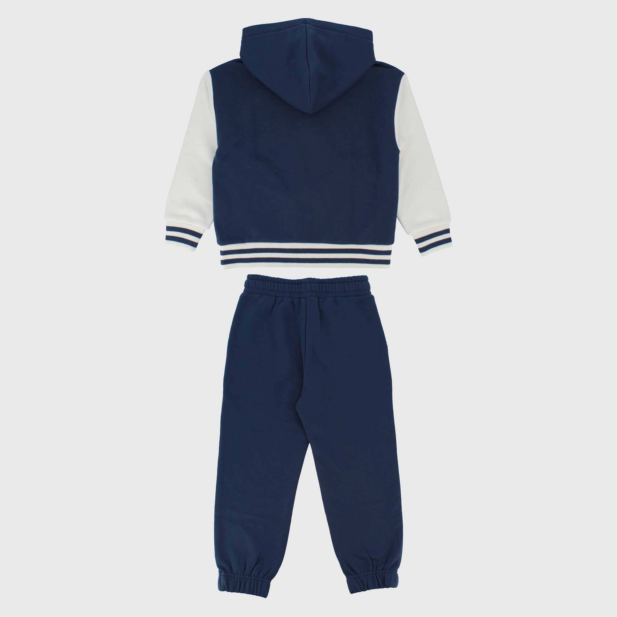 Trainingsanzug mit weich gebürsteter Innenseite, bestehend aus zwei Teilen. Kapuzenpullover, lange Ärmel. Reißverschluss vorne. Leistentaschen. Frontdruck. Gestreifter, gerippter Saum und Bündchen. Fleecehose mit elastischem Bund und Schnürsenkeln vorne. Vordertaschen und elastischer Boden.