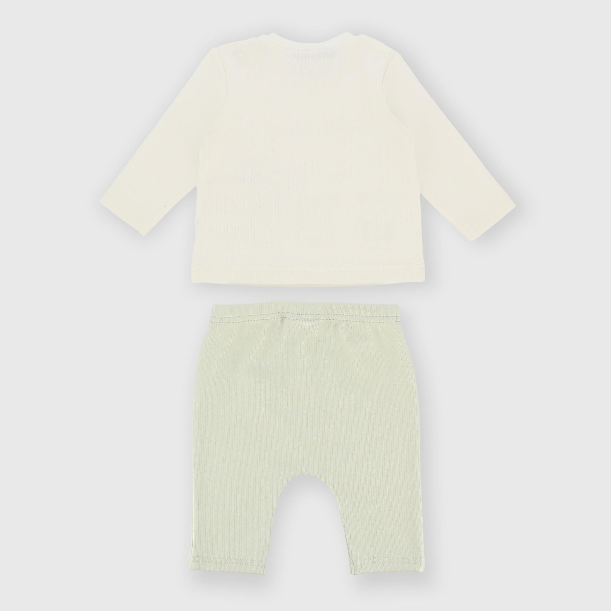 Set gerippt bestehend aus zwei Teilen. Langarm-T-Shirt mit Rundhalsausschnitt. Druckknopfverschluss an der Schulter. Tierdruck auf der Vorderseite. Hose mit elastischem Bund.
