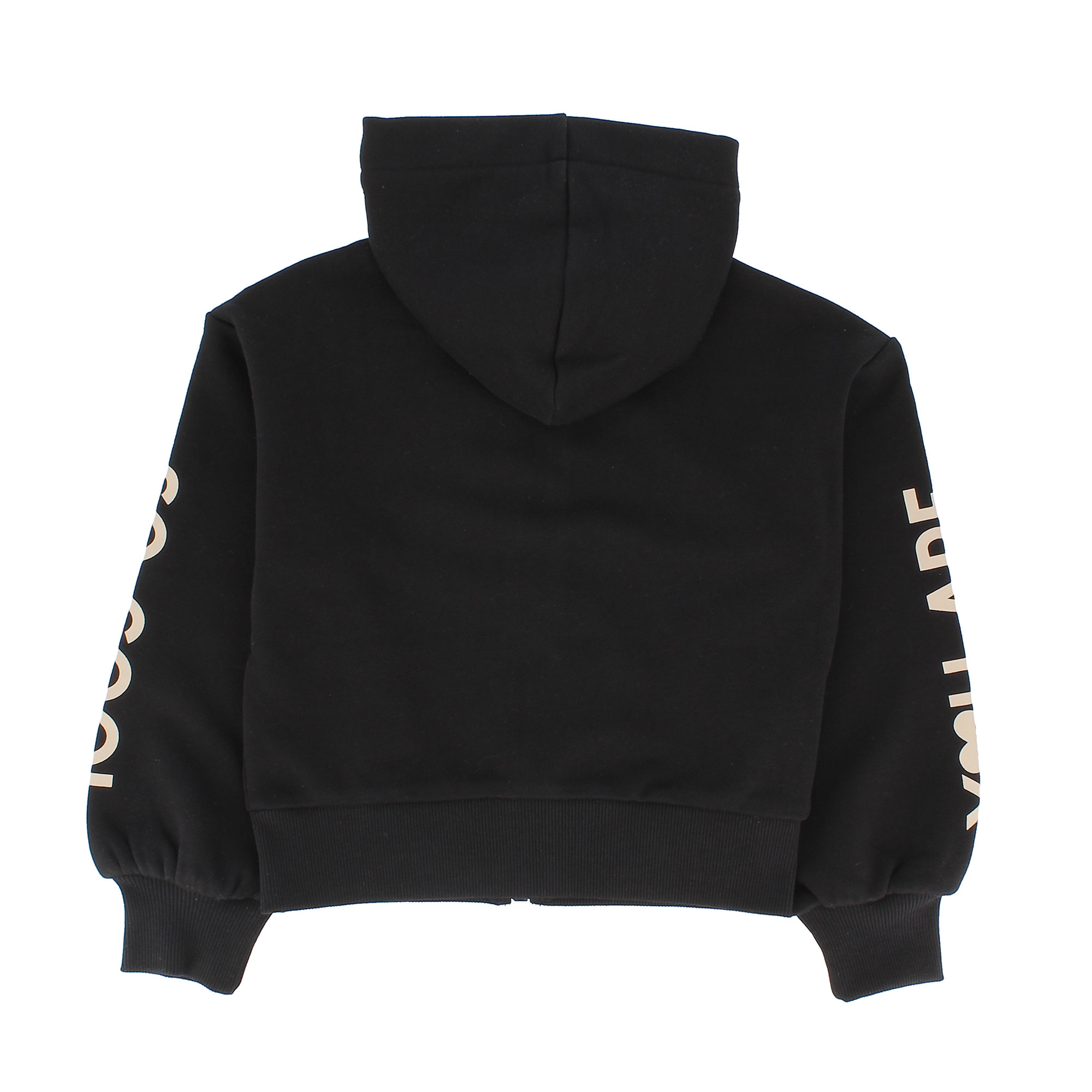 Sweatshirt mit Kapuze und langen Ballonärmeln. Reißverschluss auf der Vorderseite. Aufschrift auf den Ärmeln.
