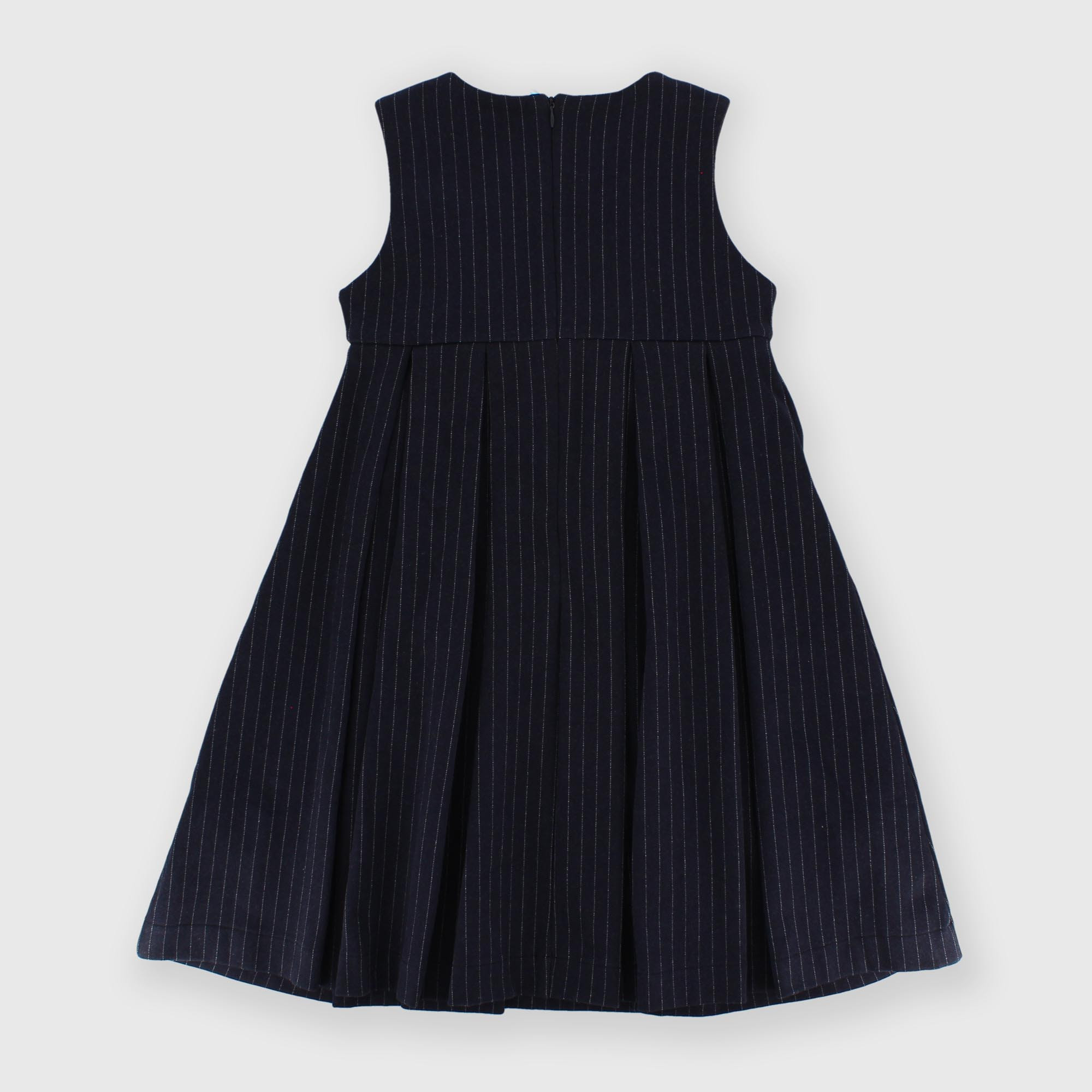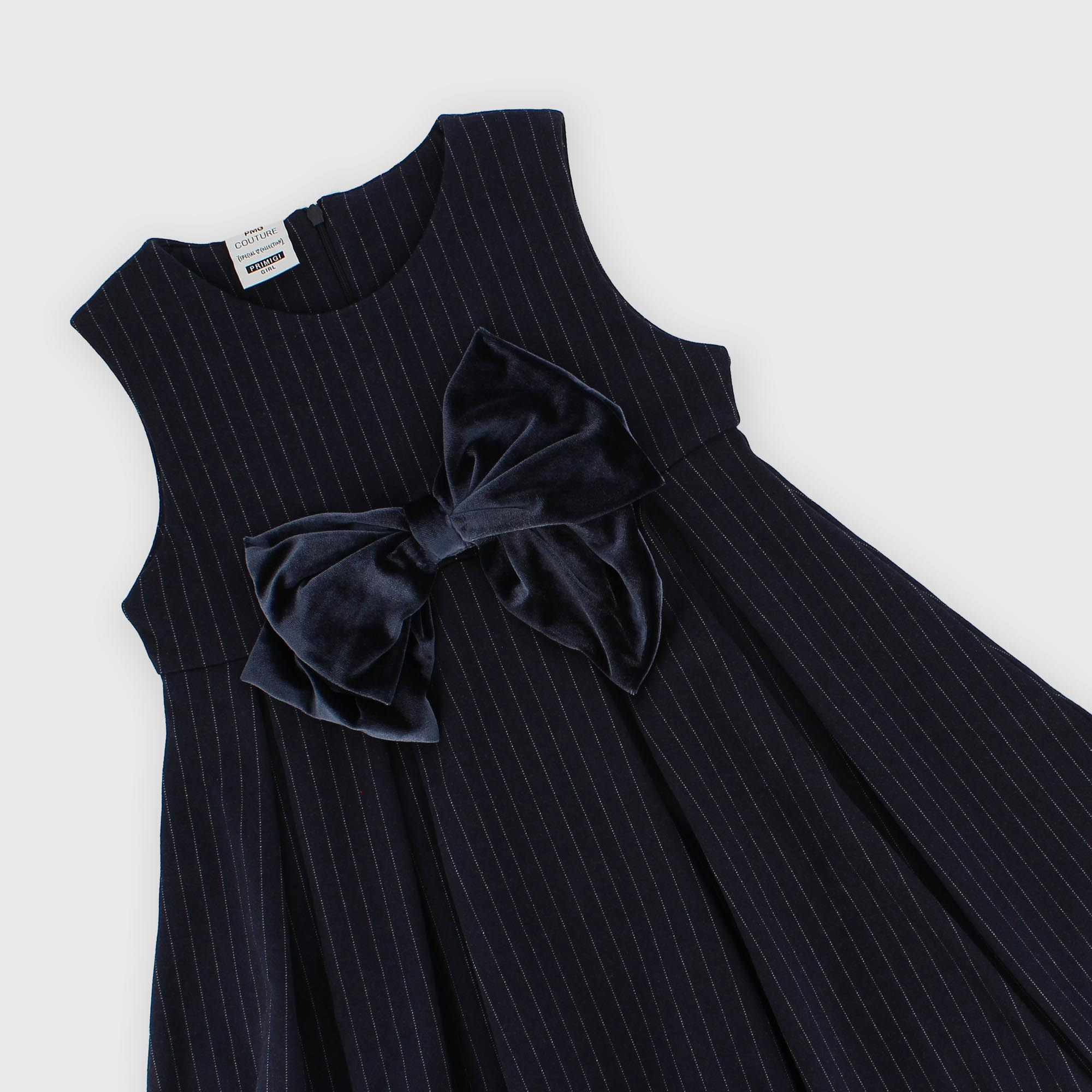 Kleid aus gestreiftem Stoff, Rundhalsausschnitt, ohne Ärmel. Reißverschluss hinten. Schräg auf der Vorderseite aufgenähte Samtschleife.