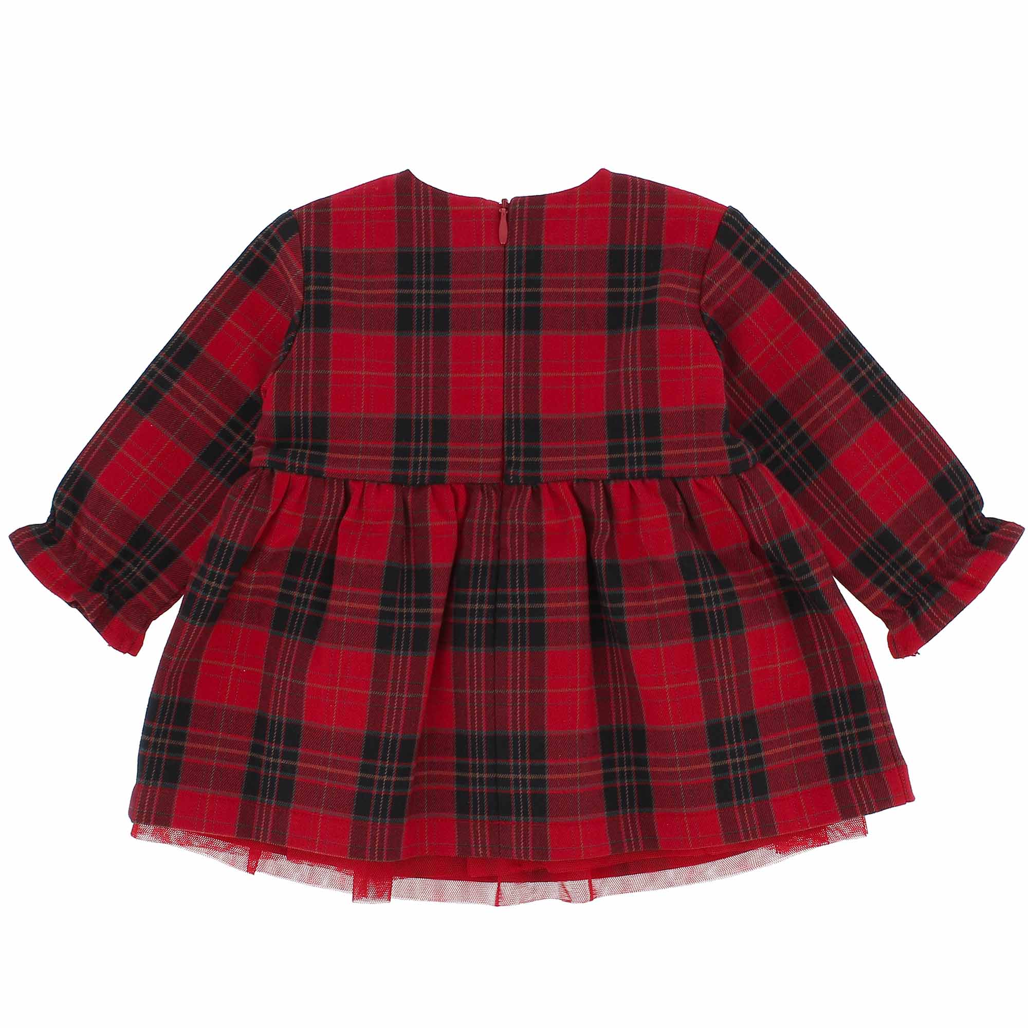 Kleid aus Schottenstoff mit Kragen und langen Ärmeln. Reißverschluss hinten. Unterrock aus Tüll. Futter aus Viskose.