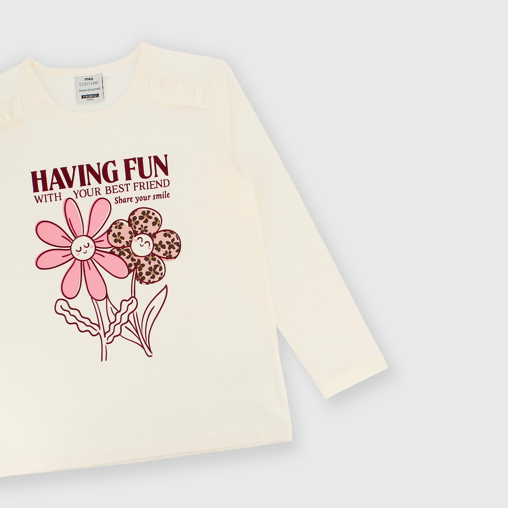 T-Shirt aus elastischem Jersey, Rundhalsausschnitt, mit langen Ärmeln. Kleine Volants an den Schultern. Druck mit Flockdetails auf der Vorderseite.
