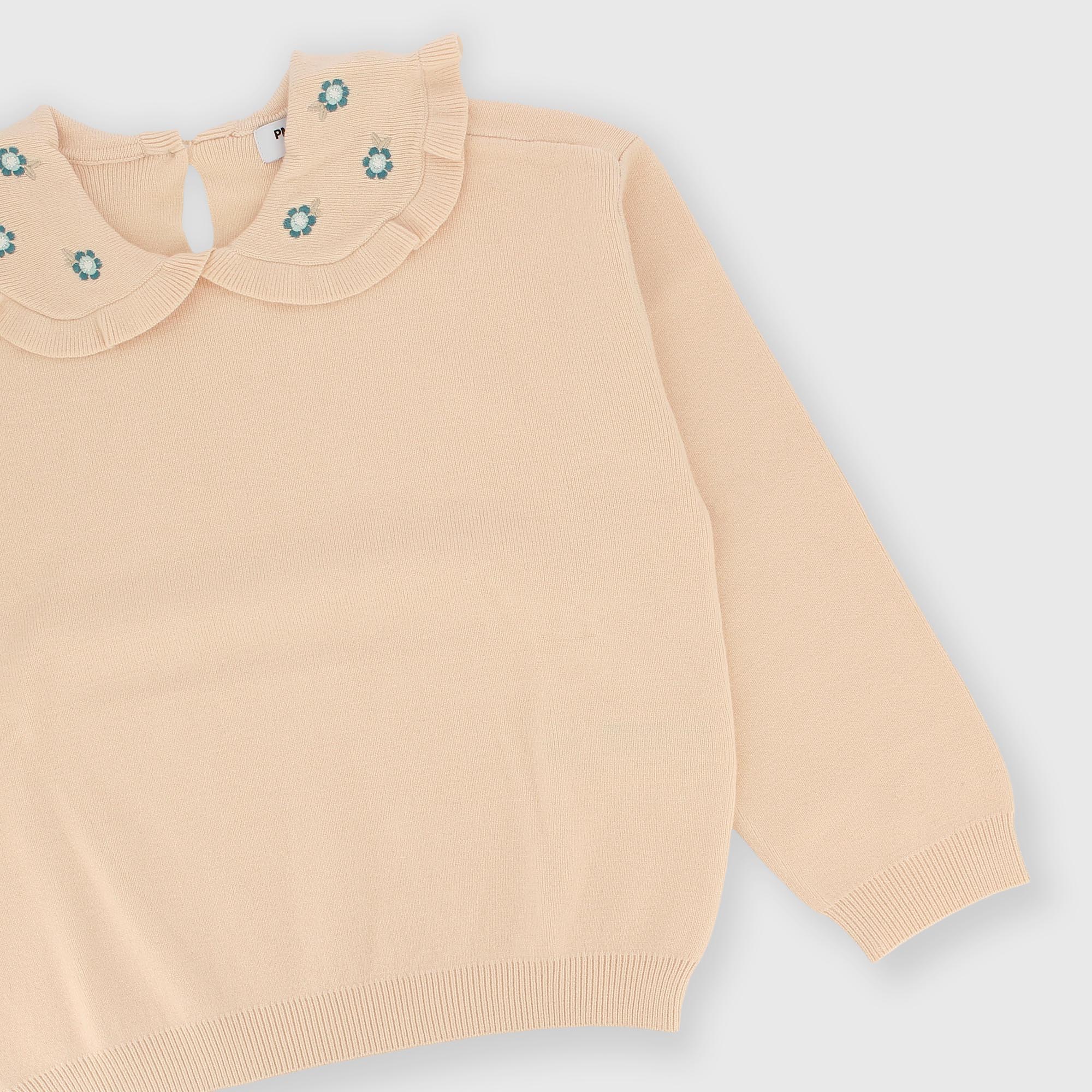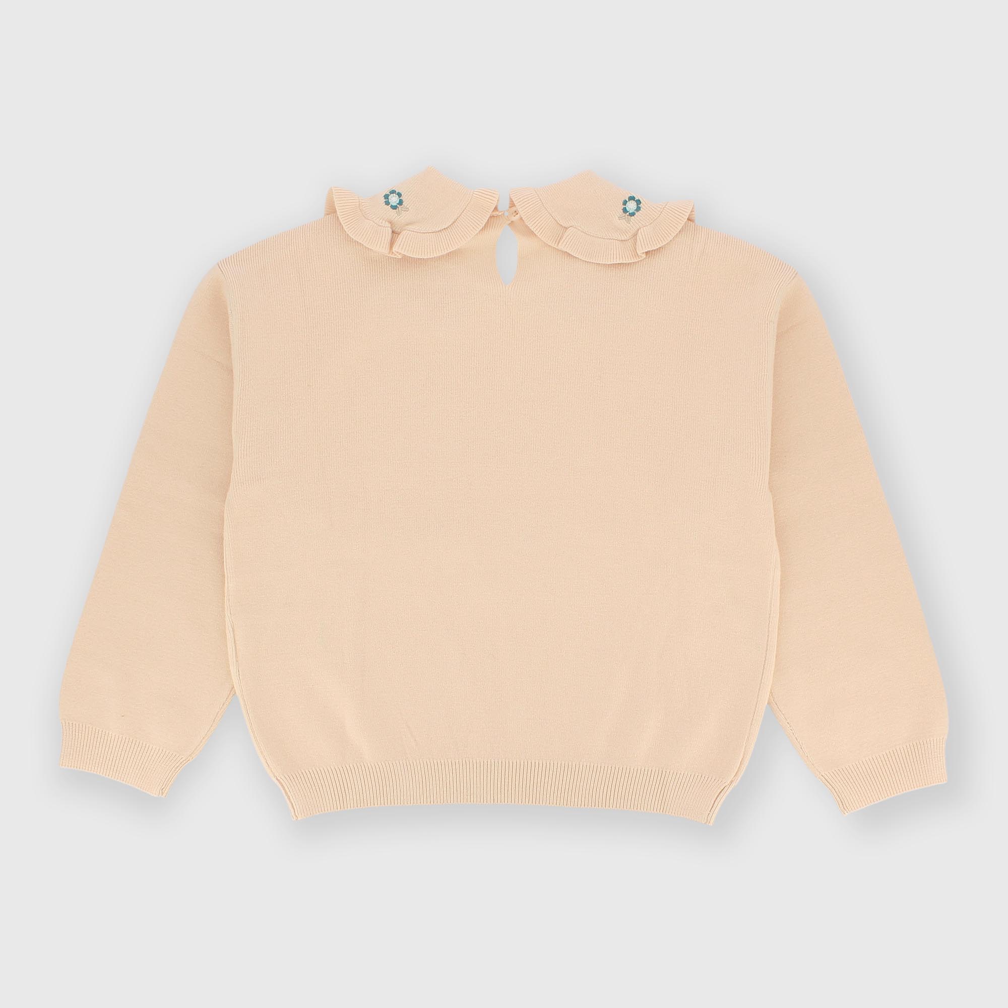 Pullover aus weichem Strick mit langen Ärmeln. Tropfenverschluss mit Knopf auf der Rückseite. Runder Kragen mit Stickereien.
