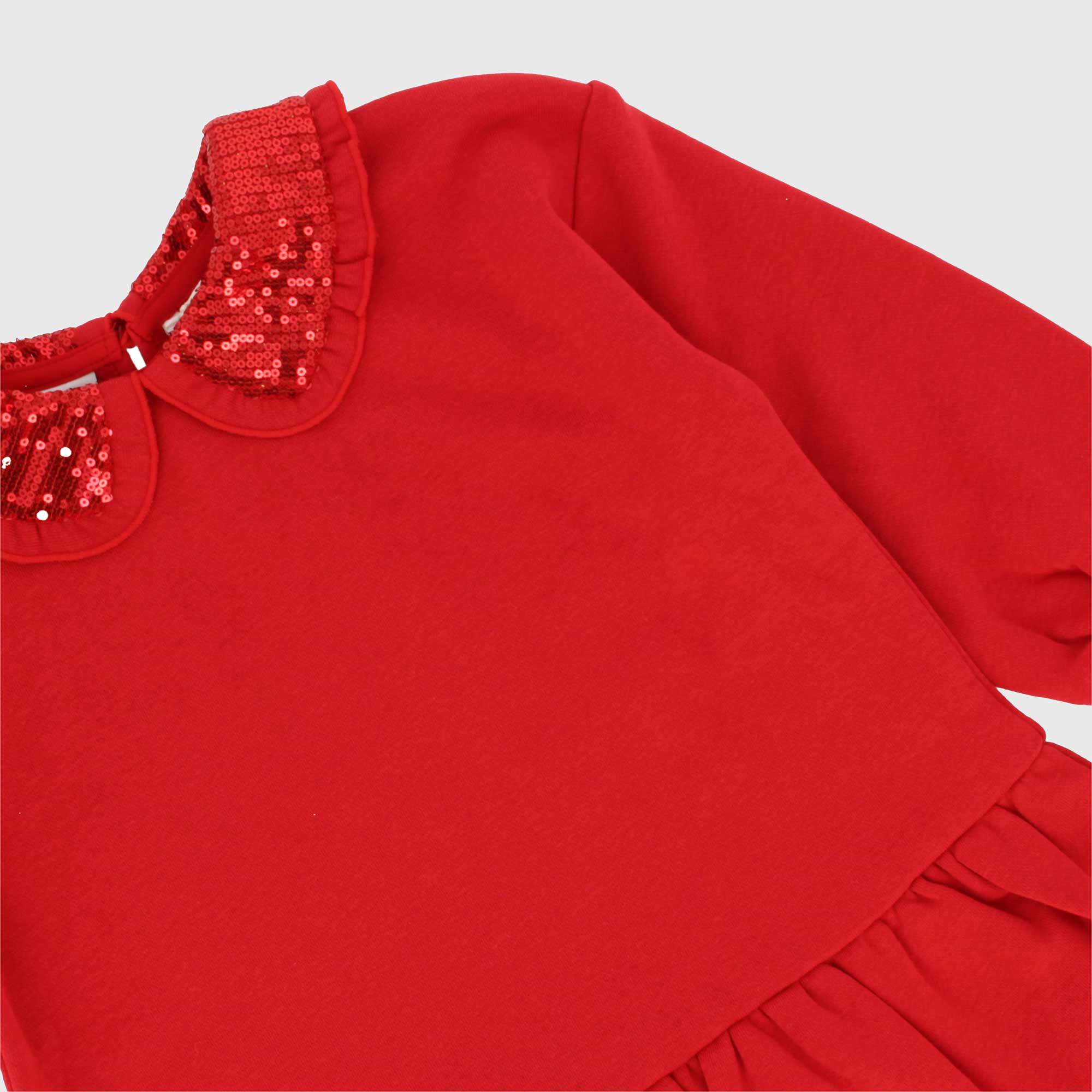 Sweatshirtkleid mit Paillettenkragen und langen Ärmeln. Verschluss mit Knopf auf der Rückseite.