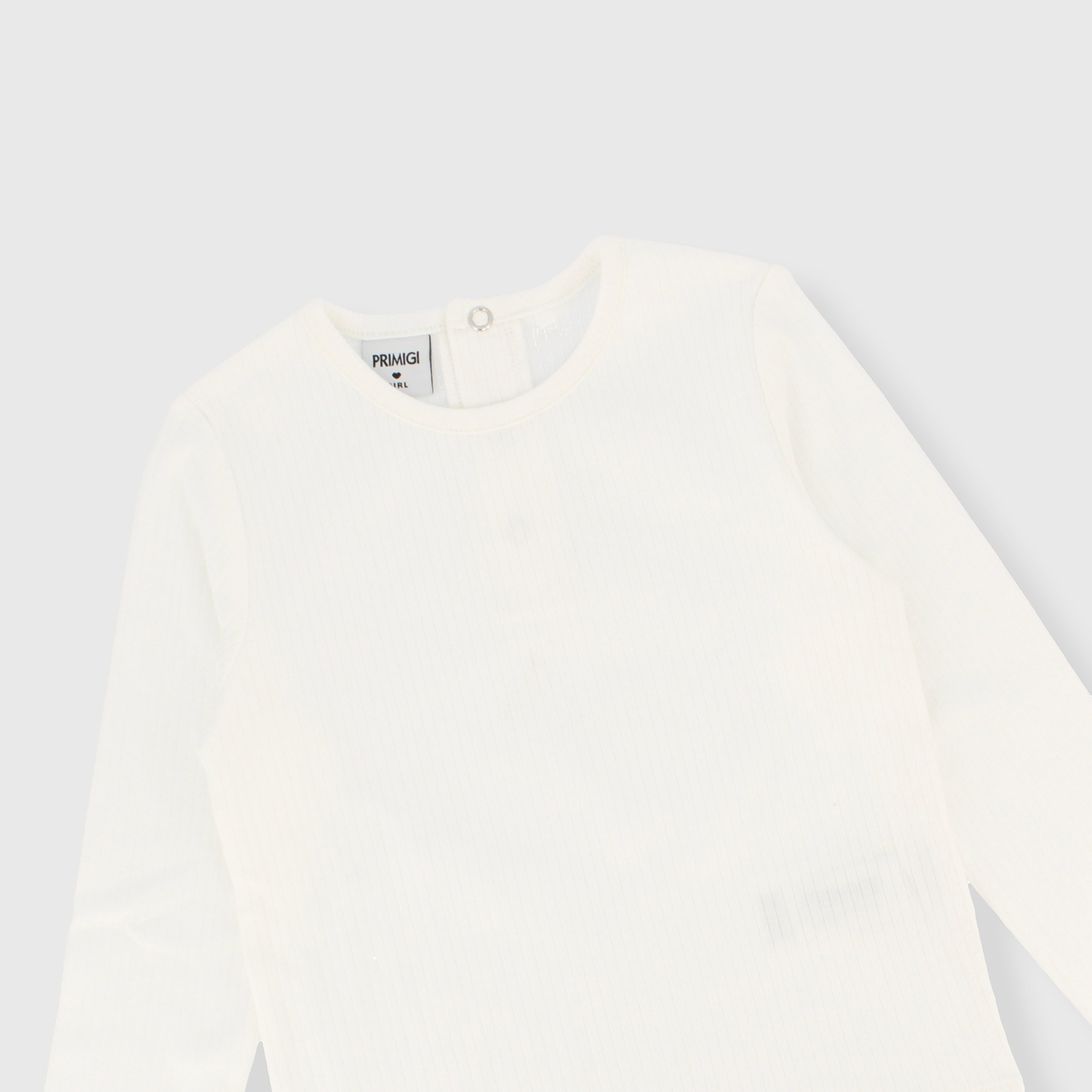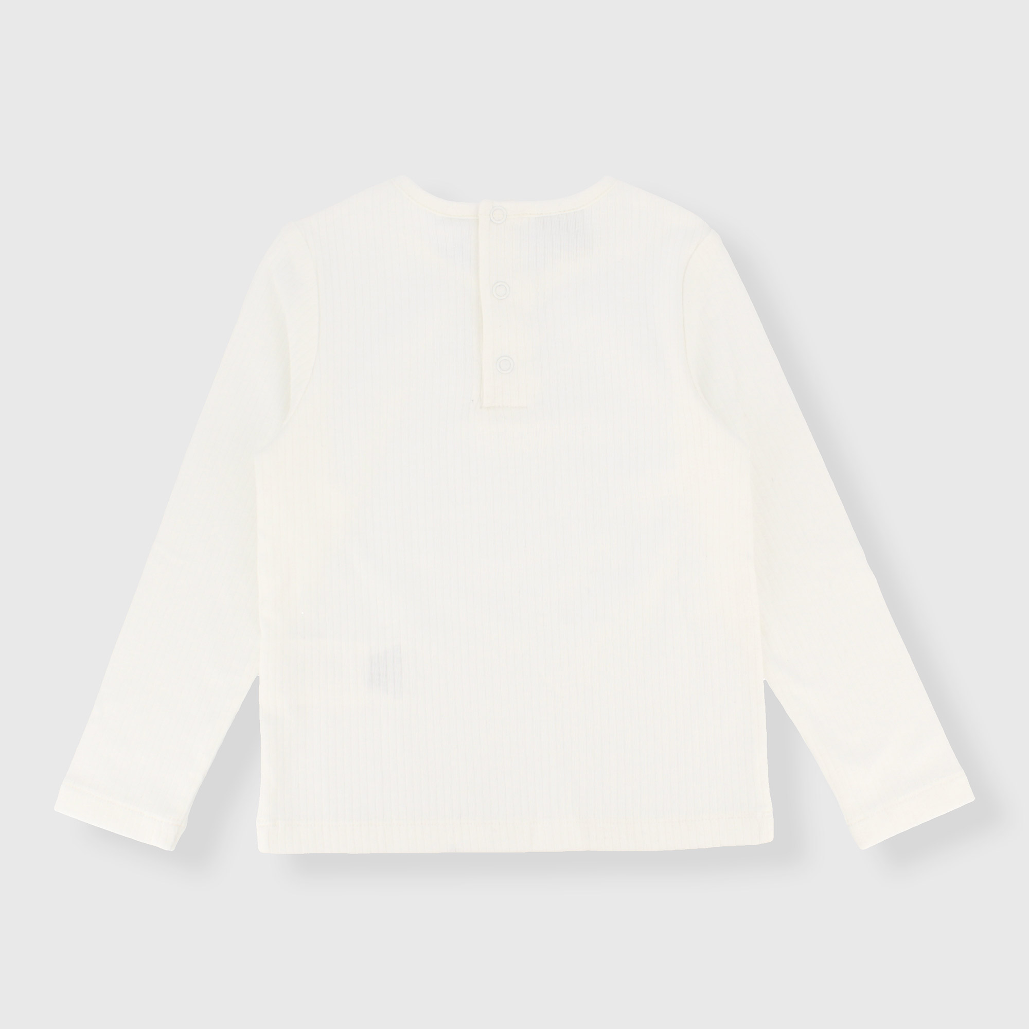 Geripptes Langarm-T-Shirt mit Rundhalsausschnitt. Verschluss mit automatischen Knöpfen auf der Rückseite.