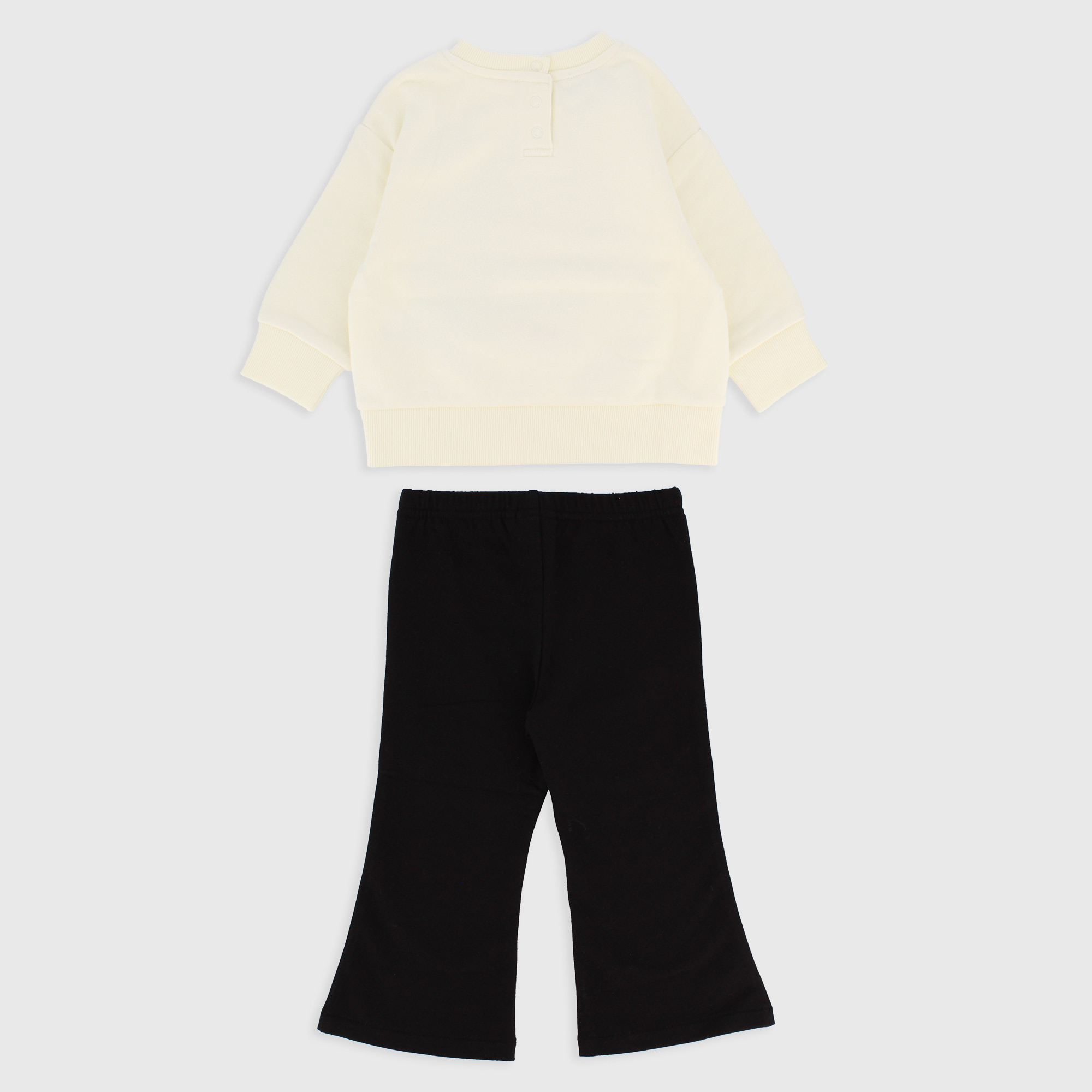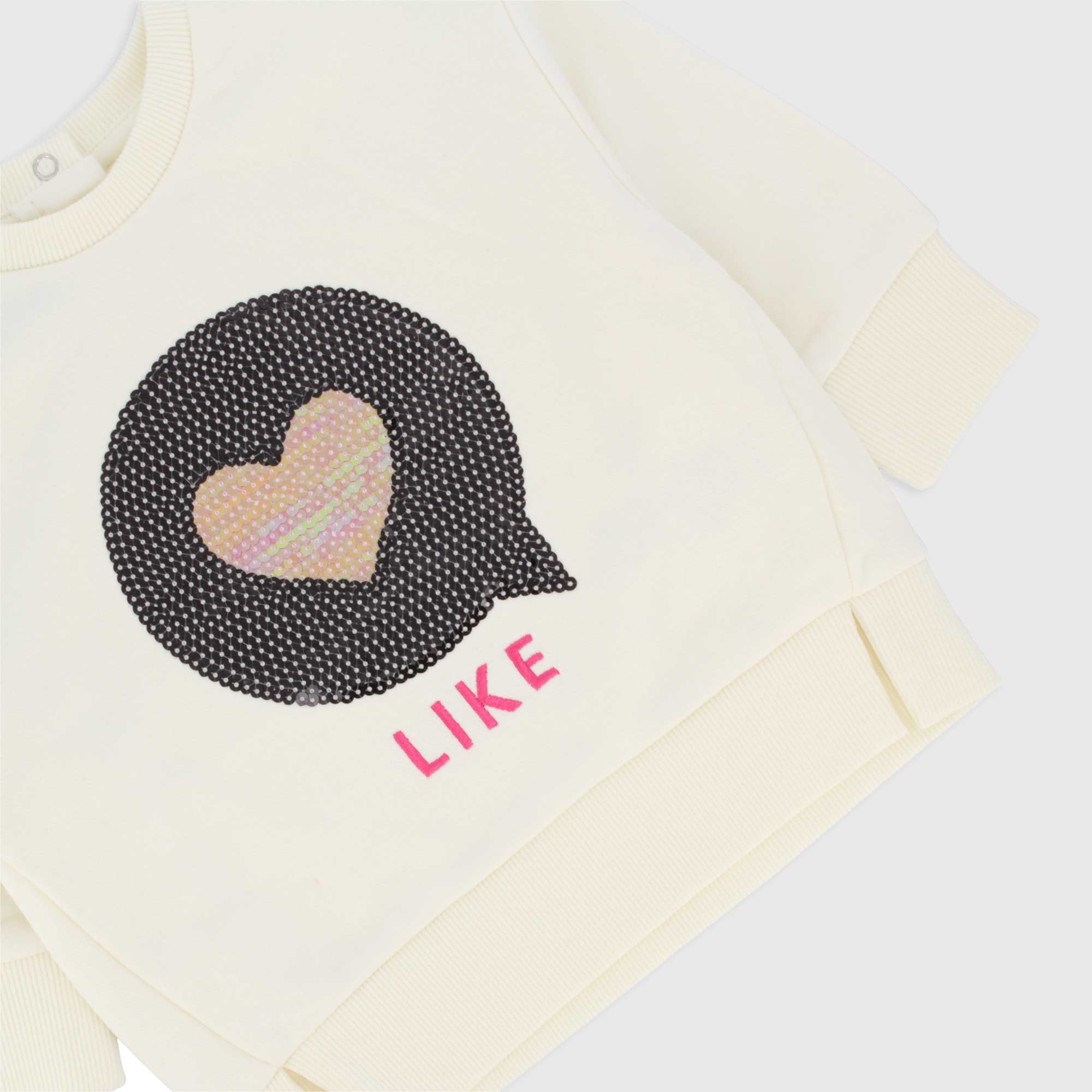 Anzug bestehend aus zwei Teilen. Sweatshirt mit Rundhalsausschnitt und langen Ärmeln. Druckknopfverschluss auf der Rückseite. Paillettendruck auf der Vorderseite. Fleece-Hose mit elastischem Bund.