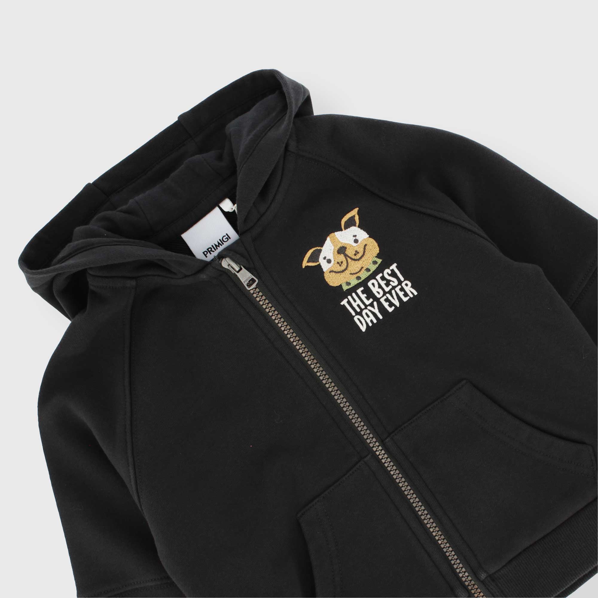 Offenes Kapuzensweatshirt mit langen Ärmeln. Reißverschluss vorne. Stickerei auf Brust und Ärmel. Kängurutasche. Gerippte Bündchen und Saum.