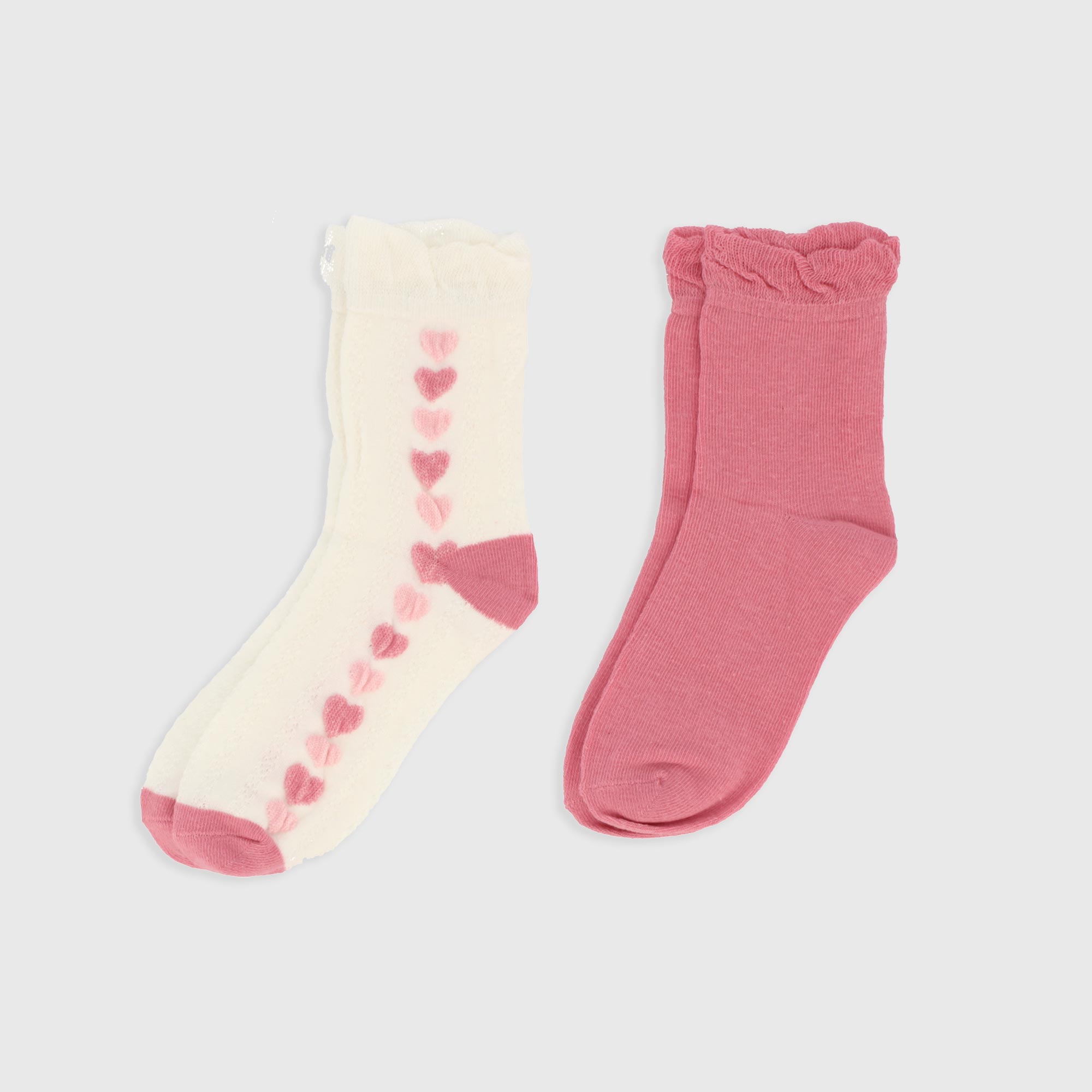 Packung bestehend aus zwei Paar Socken. Eine einfarbige und eine mit Herzmotiv. Wellensaum und elastische Kanten.