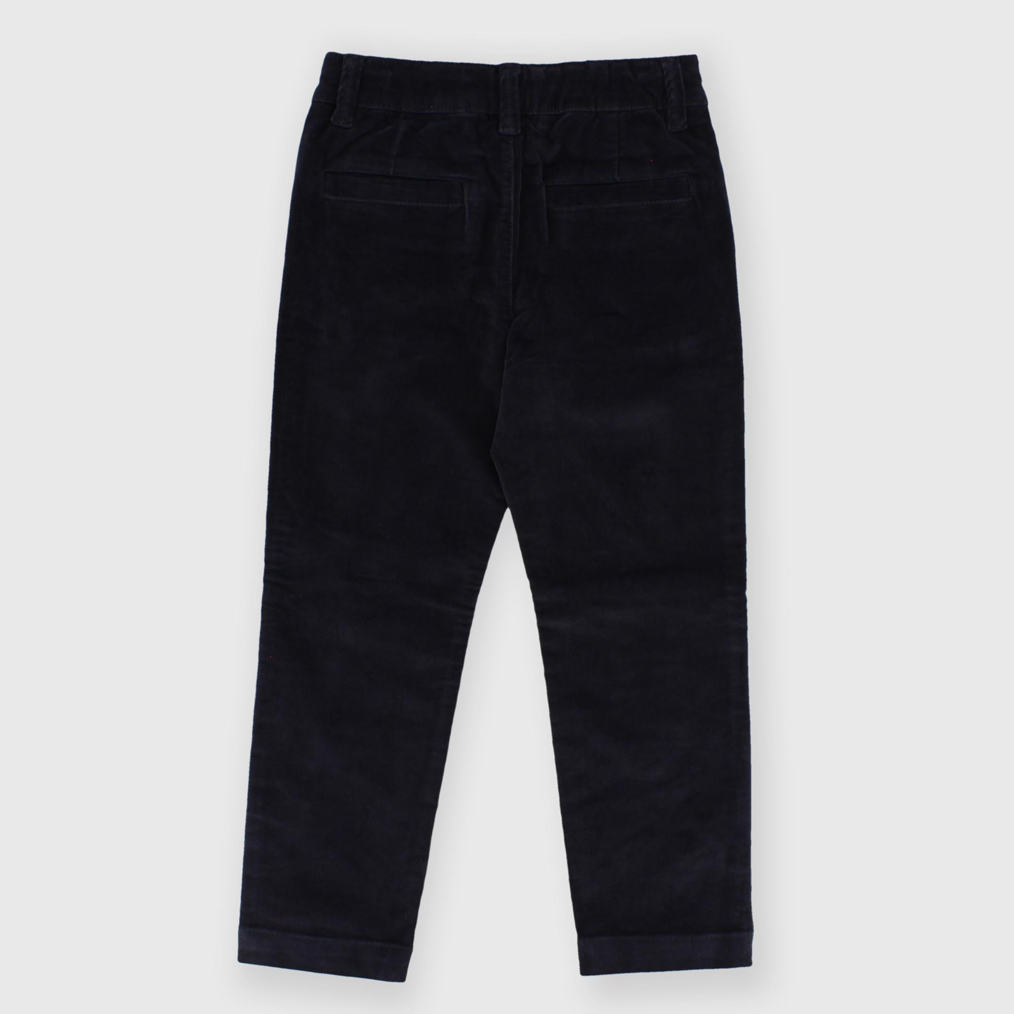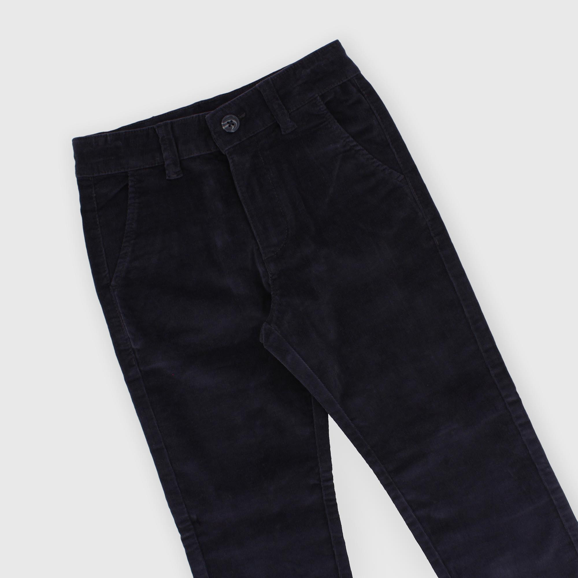 Samt-Hosen mit verstellbarem Bund innen. Schließung mit Knopf und Reißverschluss. Französische Taschen vorne und Paspeltaschen hinten.