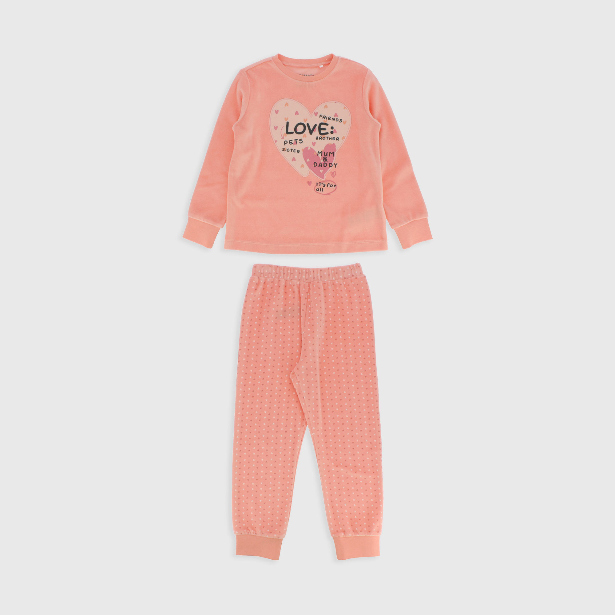 Chenille-Pyjama-Set. Langärmliger Pullover mit Rundhalsausschnitt und Stickerei auf der Vorderseite. Hose mit elastischem Bund und geripptem Saum. Allover-Herzendruck.