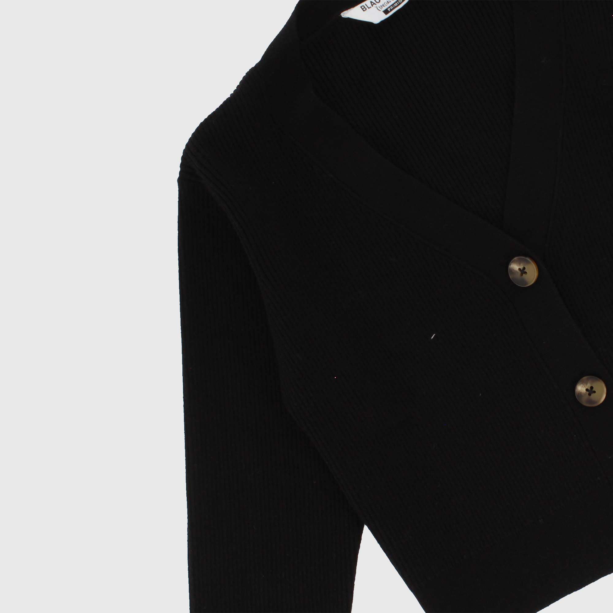 Strickjacke aus Rippstrick, Rundhalsausschnitt, lange Ärmel. Knopfverschluss vorne.